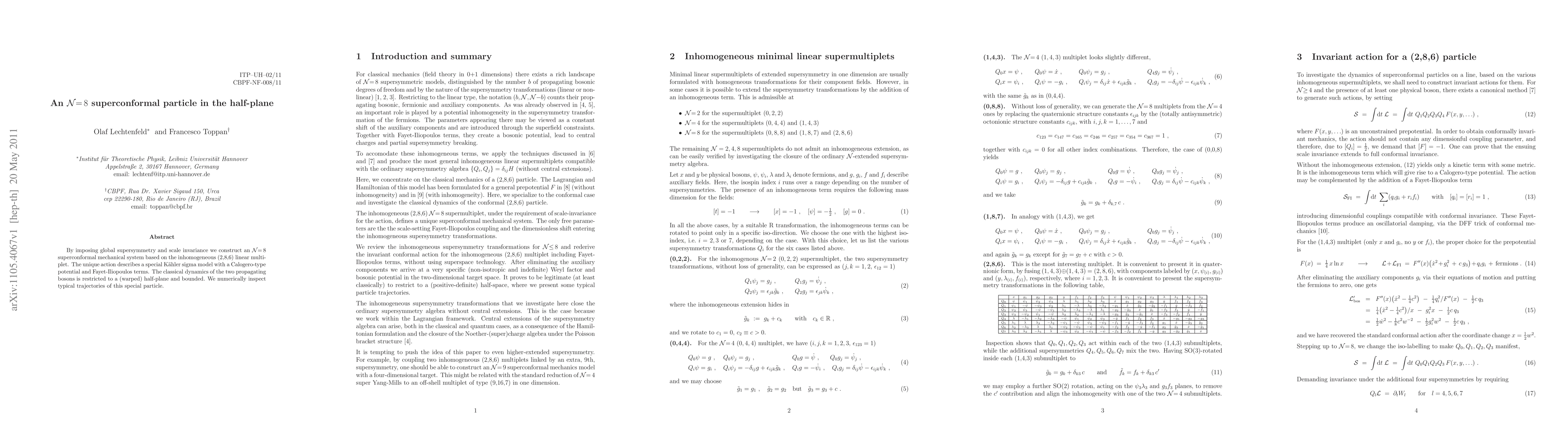 By imposing global supersymmetry and scale invariance we construct an N=8 superconformal mechanical system based on the inhomogeneous (2,8,6) linear multiplet. The unique action describes a special K"ahler sigma model with a Calogero-type potential and Fayet-Iliopoulos terms. The classical dynamics of the two propagating bosons is restricted to a (warped) half-plane and bounded. We numerically inspect typical trajectories of this special particle.
