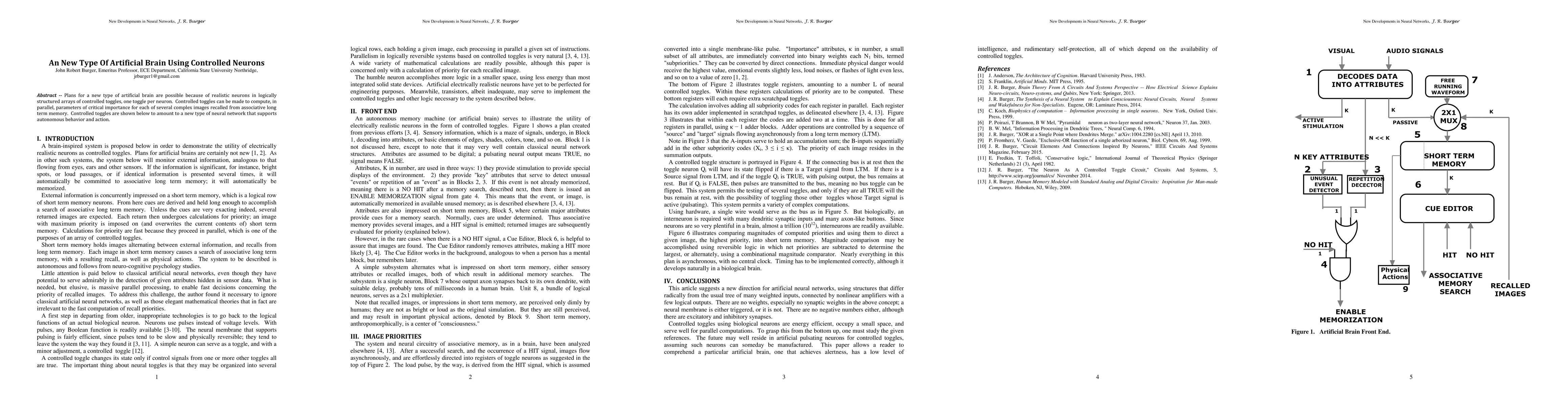 Plans for a new type of artificial brain are possible because of realistic neurons in logically structured arrays of controlled toggles, one toggle per neuron. Controlled toggles can be made to compute, in parallel, parameters of critical importance for each of several complex images recalled from associative long term memory. Controlled toggles are shown below to amount to a new type of neural network that supports autonomous behavior and action.
