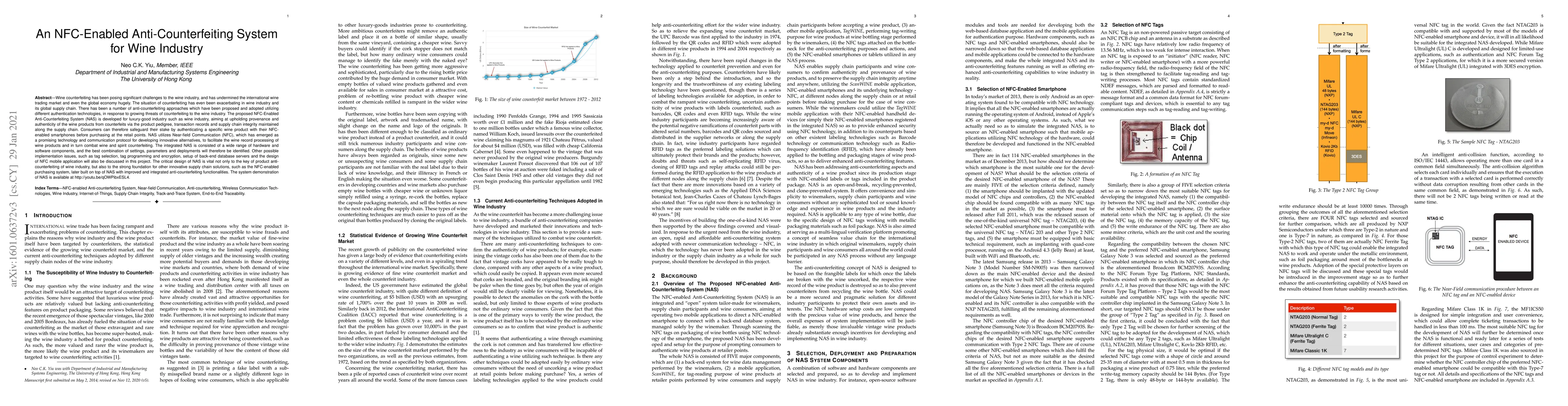 Wine counterfeiting has been posing significant challenges to wine industry, and has undermined the international wine trading market and the global economy hugely. The situation of counterfeiting has even been exacerbating in wine industry and global supply chain. There has been a number of anti-counterfeiting approaches which have been proposed and adopted utilizing different authentication technologies, in response to growing threats of counterfeiting to wine industry. The proposed NFC-Enabled Anti-Counterfeiting System (NAS) is developed for luxury-good industry such as wine industry, aiming at upholding provenance and authenticity of wine products from counterfeits via the product pedigree, transaction records and supply chain integrity maintained along the supply chain. Consumers can therefore safeguard their stake by authenticating a specific wine product with their NFC-enabled smartphones before purchasing at the retail points. NAS utilizes Near-field Communication (NFC), which has emerged as a promising technology and communication protocol for developing innovative alternatives, to facilitate the wine record processing of wine products and in turn combat wine and spirit counterfeiting. The integrated NAS is consisted of a wide range of hardware and software components, and the best combination of settings, parameters and deployments will therefore be identified. Other possible implementation issues, such as tag selection, tag programming and encryption, setup of back-end database servers and the design of NFC mobile application will also be discussed in this project. The critical design of NAS is vital not only to the key of product anti-counterfeiting of wine industry, but also to the strong foundation for other innovative supply chain solutions, such as the NFC-enabled purchasing system, developed on top of NAS with improved and integrated anti-counterfeiting functionalities.