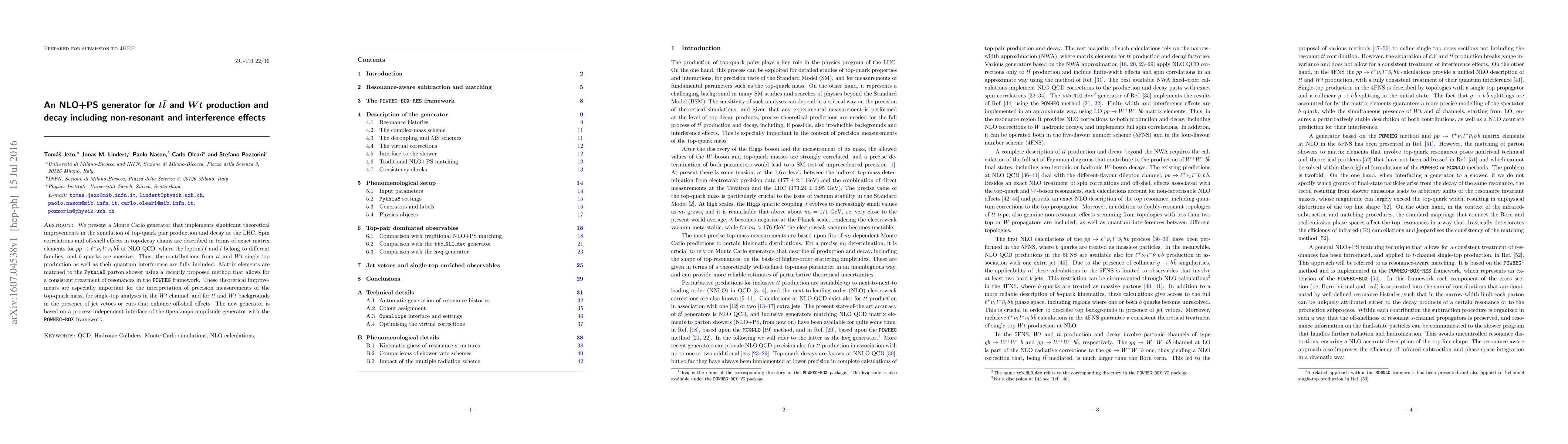 We present a Monte Carlo generator that implements significant theoretical improvements in the simulation of top-quark pair production and decay at the LHC. Spin correlations and off-shell effects in top-decay chains are described in terms of exact matrix elements for $p p \to \ell^+\nu_{\scriptscriptstyle\ell}\, l^-\bar{\nu}_{\scriptscriptstyle l} b \bar{b}$ at NLO QCD, where the leptons $\ell$ and $l$ belong to different families, and $b$ quarks are massive. Thus, the contributions from $t\bar{t}$ and $Wt$ single-top production as well as their quantum interference are fully included. Matrix elements are matched to the Pythia8 parton shower using a recently proposed method that allows for a consistent treatment of resonances in the POWHEG framework. These theoretical improvements are especially important for the interpretation of precision measurements of the top-quark mass, for single-top analyses in the $Wt$ channel, and for $t\bar{t}$ and $Wt$ backgrounds in the presence of jet vetoes or cuts that enhance off-shell effects. The new generator is based on a process-independent interface of the OpenLoops amplitude generator with the POWHEGBOX framework.