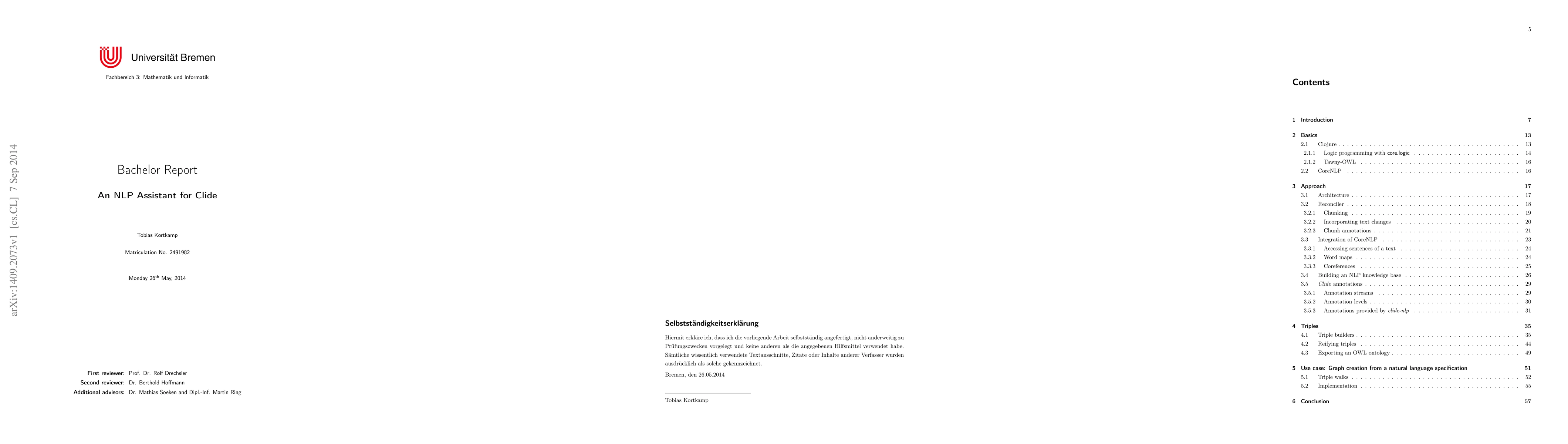 This paper presents an NLP assistant for the Clide environment, facilitating NLP application development by visualizing text dependencies and extracting semantic information. The tool creates an NLP database from mined triples and coreference chains, demonstrated through translating natural language descriptions into annotated graphs.