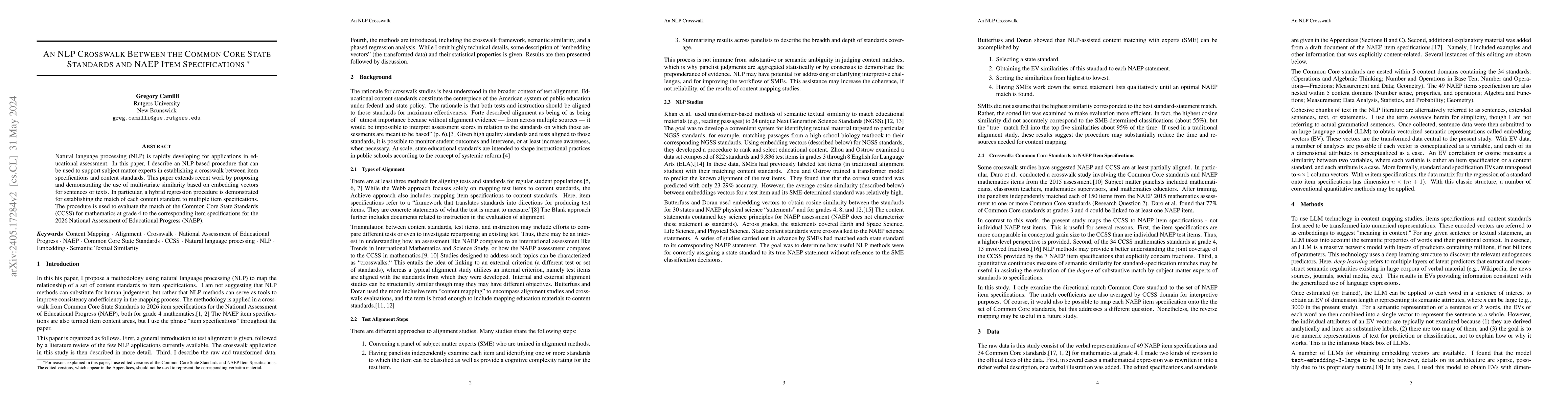 This paper develops an NLP-based method to establish a crosswalk between educational content standards and item specifications using multivariate similarity from embedding vectors, demonstrated through a hybrid regression procedure. It evaluates the match of 4th-grade Common Core State Standards to 2026 NAEP item specifications.