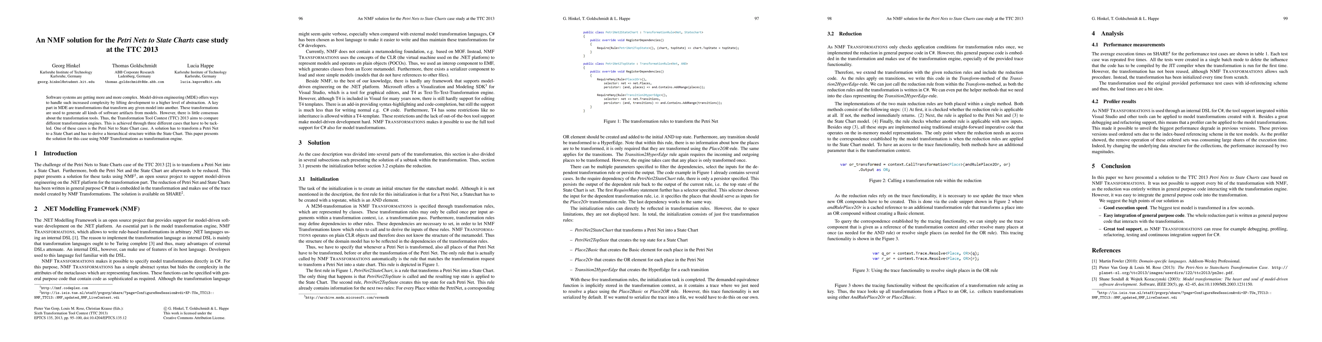 Software systems are getting more and more complex. Model-driven engineering (MDE) offers ways to handle such increased complexity by lifting development to a higher level of abstraction. A key part in MDE are transformations that transform any given model into another. These transformations are used to generate all kinds of software artifacts from models. However, there is little consensus about the transformation tools. Thus, the Transformation Tool Contest (TTC) 2013 aims to compare different transformation engines. This is achieved through three different cases that have to be tackled. One of these cases is the Petri Net to State Chart case. A solution has to transform a Petri Net to a State Chart and has to derive a hierarchical structure within the State Chart. This paper presents the solution for this case using NMF Transformations as transformation engine.