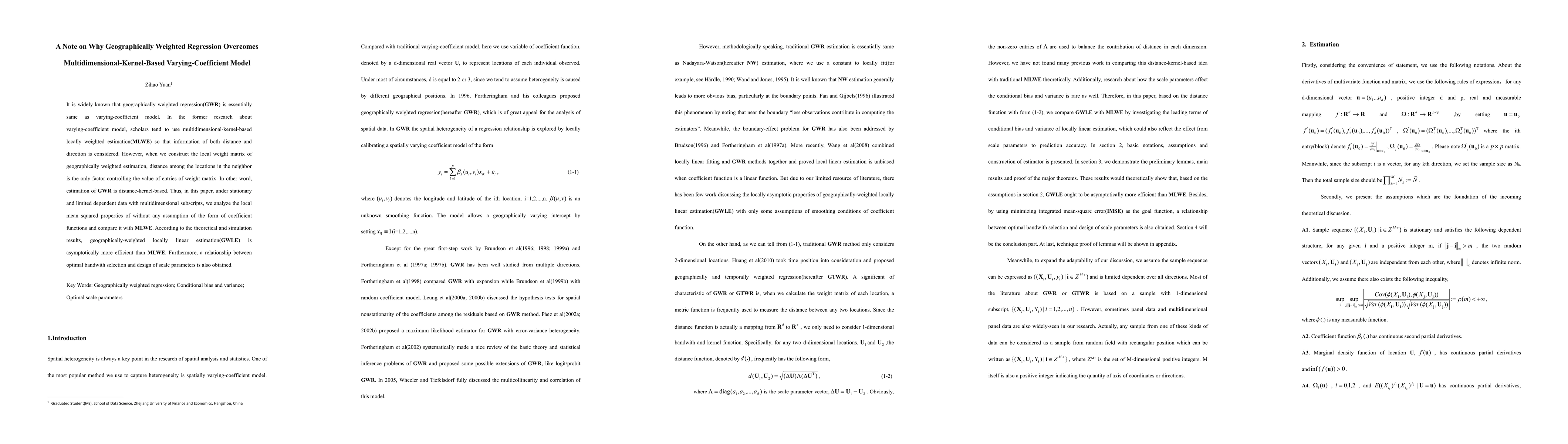 This paper compares geographically weighted regression (GWR) with multidimensional-kernel-based varying-coefficient models, demonstrating that GWR's distance-based weighting is asymptotically more efficient than the multidimensional-kernel-based locally weighted estimation (MLWE). It also explores the relationship between optimal bandwidth selection and scale parameters in GWR.