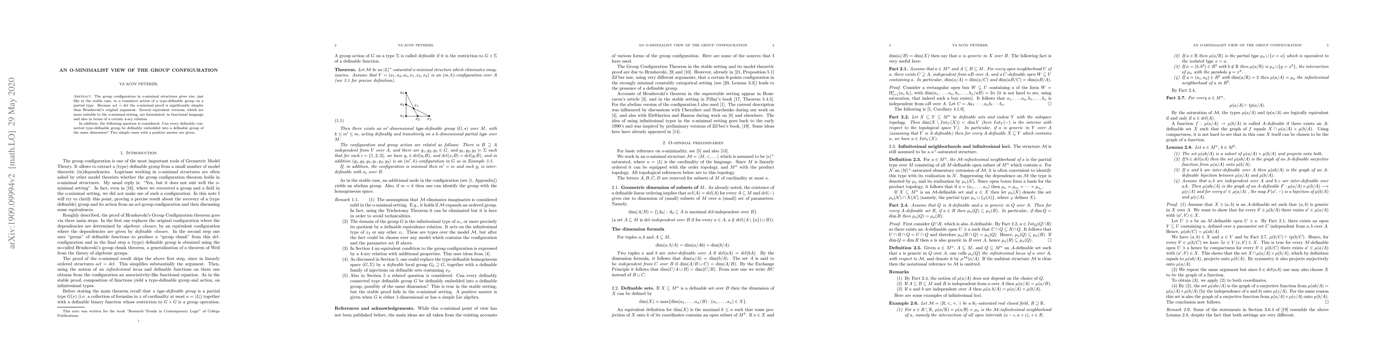 A new proof simplifies the group configuration in o-minimal structures, showing a transitive action of a type-definable group on a partial type. The study also explores the possibility of definably connected groups being embedded into others with the same dimension.