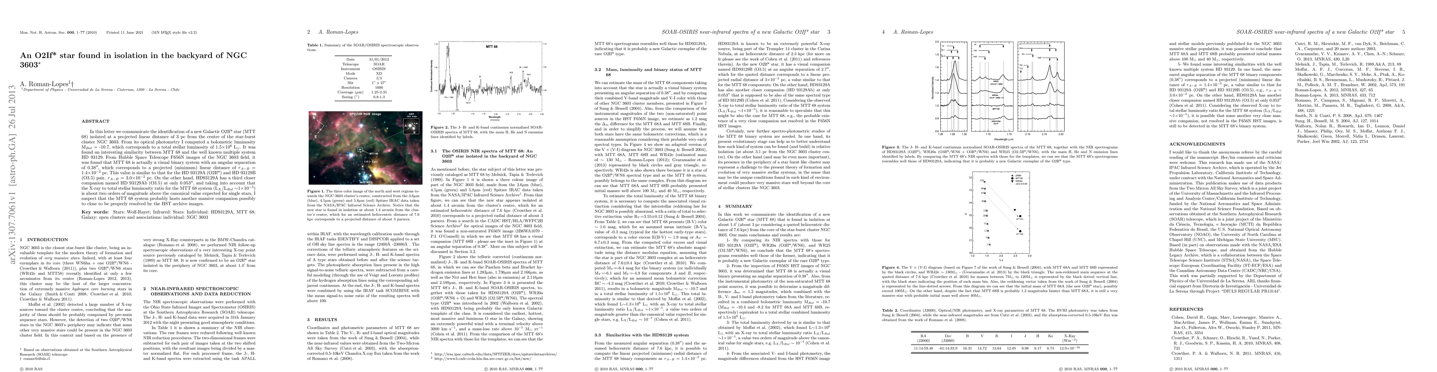 In this letter we communicate the identification of a new Galactic O2If* star (MTT 68) isolated at a projected linear distance of 3 pc from the centre of the star-burst cluster NGC 3603. From its optical photometry I computed a bolometric luminosity M_Bol = -10.7, which corresponds to a total stellar luminosity of 1.5 x 10^{6} L_Sun. It was found an interesting similarity between MTT 68 and the well known multiple system HD 93129. From Hubble Space Telescope F656N images of the NGC 3603 field, it was found that MTT 68 is actually a visual binary system with an angular separation of 0.38 arcsec, which corresponds to a projected (minimum) linear distance of r_(A-B) = 1.4 x 10^{-2} pc. This value is similar to that for the HD 93129A (O2If*) and HD 93129B (O3.5) pair, r_(A-B) = 3.0 x 10^{-2} pc. On the other hand, HD93129A has a third closer companion named HD 93129Ab (O3.5) at only 0.053 arcsec, and taking into account that the X-ray to total stellar luminosity ratio for the MTT 68 system (L_X/L_Bol 10^{-5}) is about two orders of magnitude above the canonical value expected for single stars, I suspect that the MTT 68 system probably hosts another massive companion not resolved by the HST archive images.