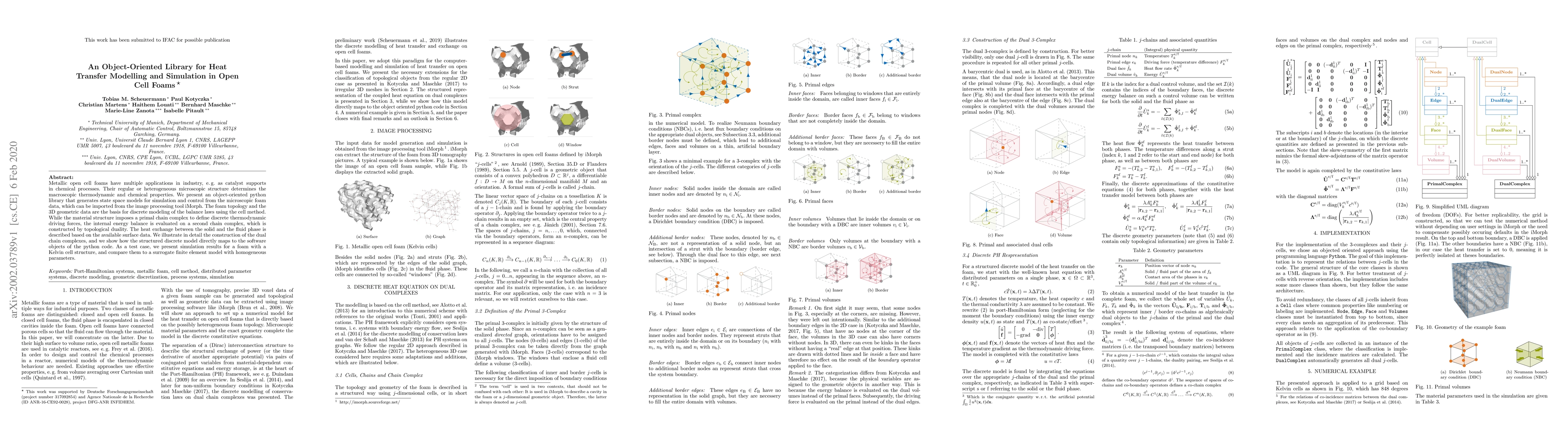 Metallic open cell foams have multiple applications in industry, e. g. as catalyst supports in chemical processes. Their regular or heterogeneous microscopic structure determines the macroscopic thermodynamic and chemical properties. We present an object-oriented python library that generates state space models for simulation and control from the microscopic foam data, which can be imported from the image processing tool iMorph. The foam topology and the 3D geometric data are the basis for discrete modeling of the balance laws using the cell method. While the material structure imposes a primal chain complex to define discrete thermodynamic driving forces, the internal energy balance is evaluated on a second chain complex, which is constructed by topological duality. The heat exchange between the solid and the fluid phase is described based on the available surface data. We illustrate in detail the construction of the dual chain complexes, and we show how the structured discrete model directly maps to the software objects of the python code. As a test case, we present simulation results for a foam with a Kelvin cell structure, and compare them to a surrogate finite element model with homogeneous parameters.