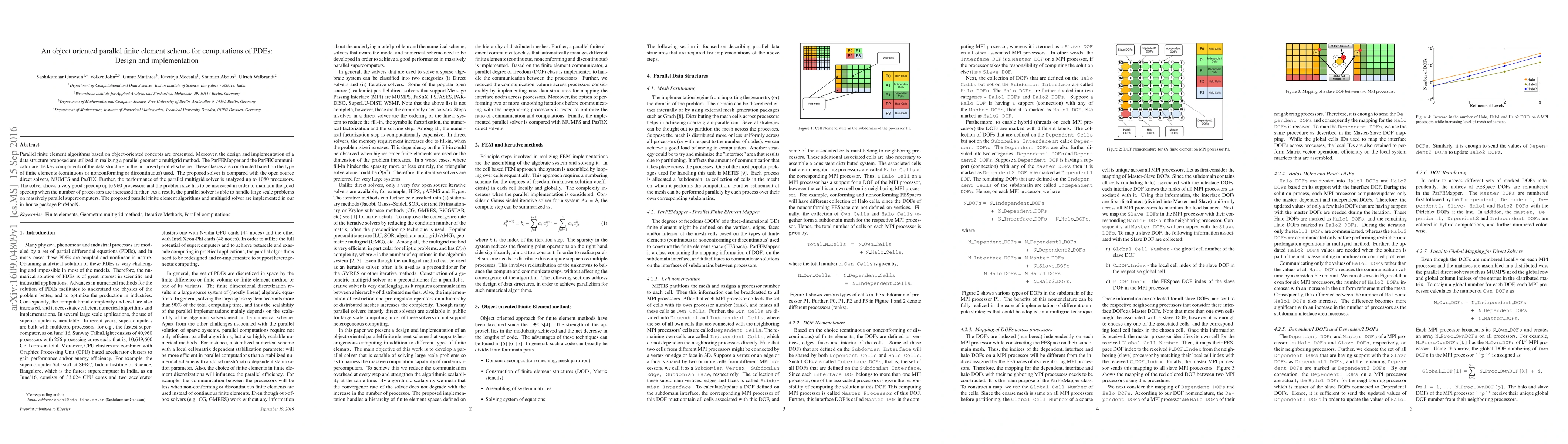 This paper presents an object-oriented parallel finite element scheme for solving PDEs, utilizing a data structure with ParFEMapper and ParFECommunicator classes. The proposed parallel multigrid solver demonstrates good speedup up to 960 processors, effectively handling large-scale problems on supercomputers.