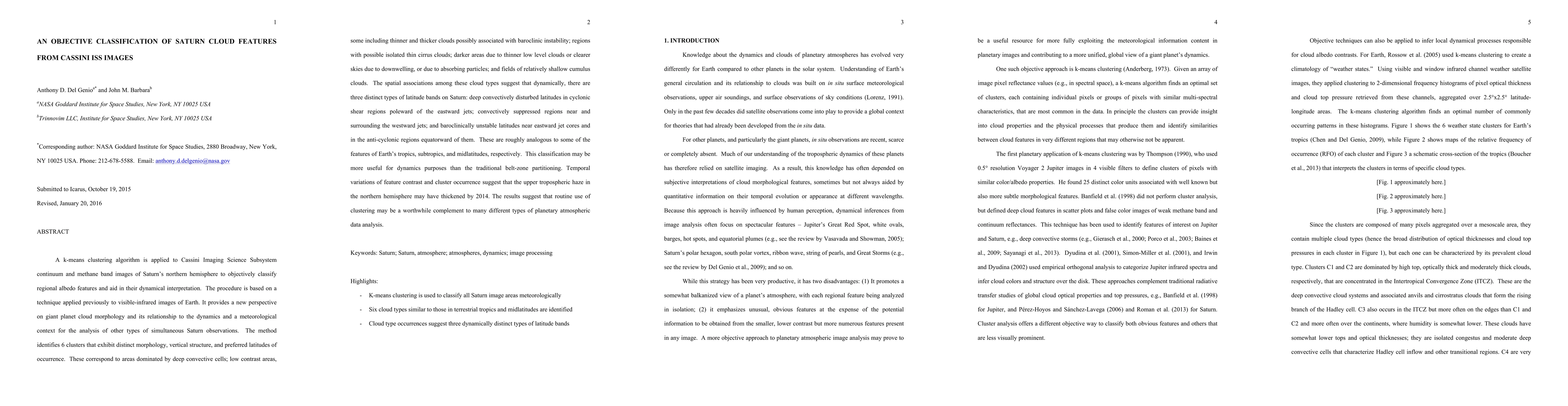 Researchers used a clustering algorithm to classify Saturn's cloud features into six distinct types based on their morphology and occurrence patterns, providing new insights into the planet's dynamic and meteorological context.