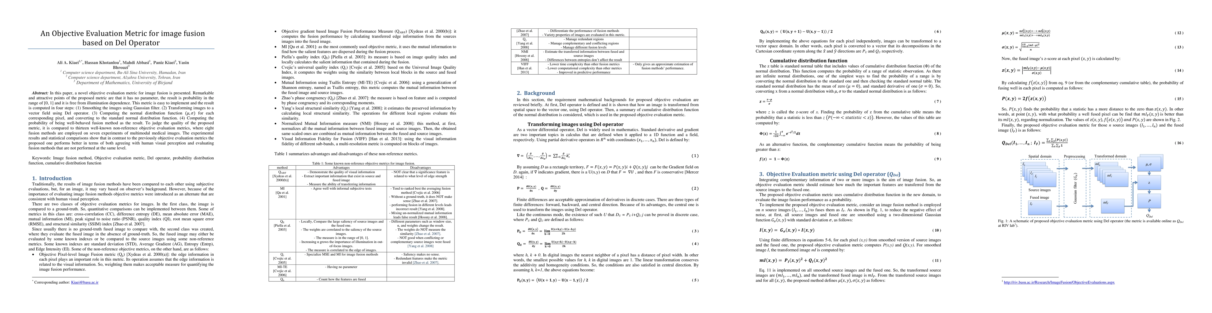 A new objective evaluation metric for image fusion is proposed, which provides a probability value between 0 and 1 without requiring parameters or illumination consideration. The metric outperforms other established methods in terms of human visual perception and evaluating fusion methods.