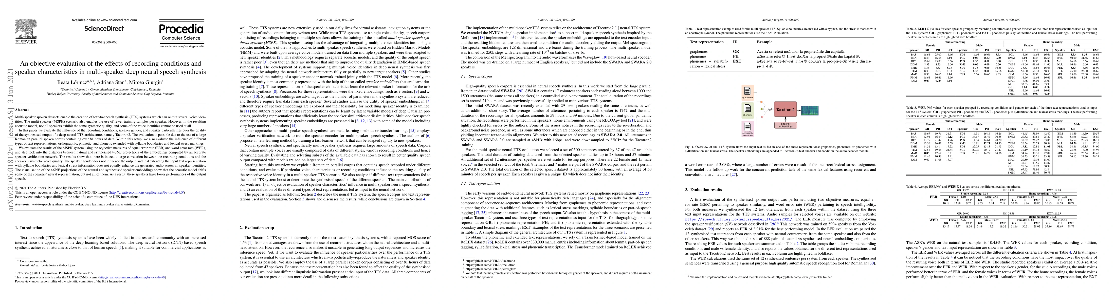 Multi-speaker spoken datasets enable the creation of text-to-speech synthesis (TTS) systems which can output several voice identities. The multi-speaker (MSPK) scenario also enables the use of fewer training samples per speaker. However, in the resulting acoustic model, not all speakers exhibit the same synthetic quality, and some of the voice identities cannot be used at all. In this paper we evaluate the influence of the recording conditions, speaker gender, and speaker particularities over the quality of the synthesised output of a deep neural TTS architecture, namely Tacotron2. The evaluation is possible due to the use of a large Romanian parallel spoken corpus containing over 81 hours of data. Within this setup, we also evaluate the influence of different types of text representations: orthographic, phonetic, and phonetic extended with syllable boundaries and lexical stress markings. We evaluate the results of the MSPK system using the objective measures of equal error rate (EER) and word error rate (WER), and also look into the distances between natural and synthesised t-SNE projections of the embeddings computed by an accurate speaker verification network. The results show that there is indeed a large correlation between the recording conditions and the speaker's synthetic voice quality. The speaker gender does not influence the output, and that extending the input text representation with syllable boundaries and lexical stress information does not equally enhance the generated audio across all speaker identities. The visualisation of the t-SNE projections of the natural and synthesised speaker embeddings show that the acoustic model shifts some of the speakers' neural representation, but not all of them. As a result, these speakers have lower performances of the output speech.