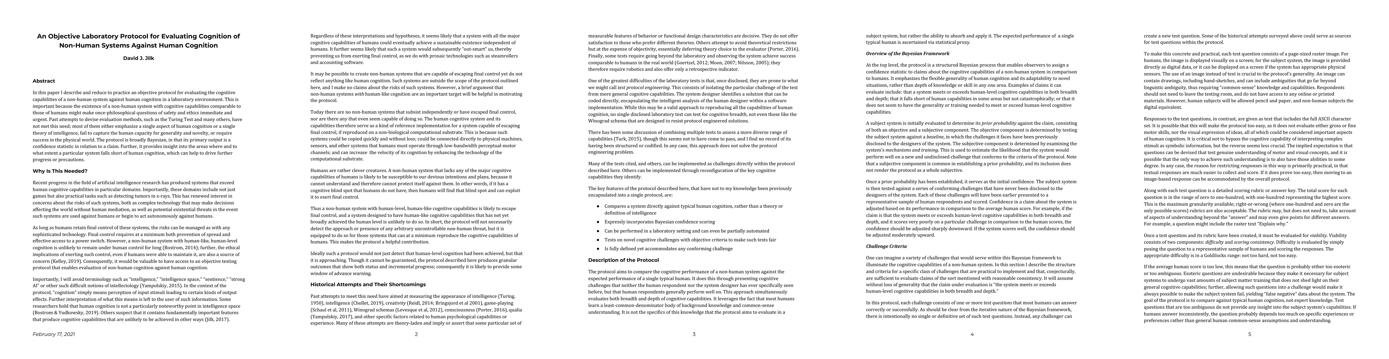 This paper proposes a new, objective laboratory protocol to evaluate non-human cognitive capabilities against human cognition, aiming to provide a more comprehensive assessment than previous methods like the Turing Test. The protocol offers a Bayesian approach to generate confidence statistics and identifies specific areas where non-human systems lag behind human cognition.