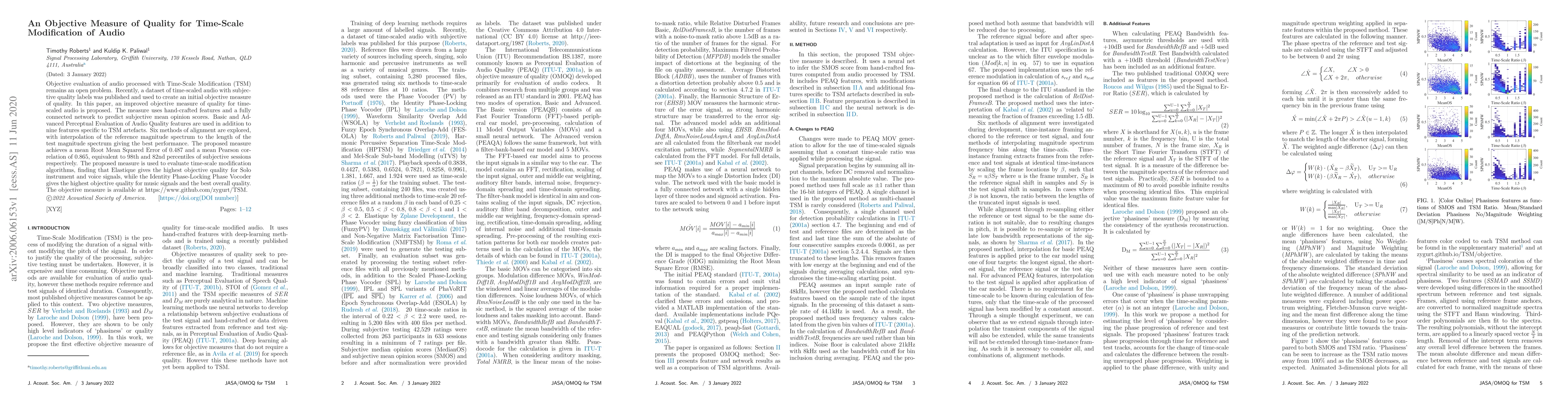 This paper proposes an improved objective measure for evaluating the quality of time-scale modified audio using hand-crafted features and a neural network. The measure achieves high correlation with subjective quality scores, identifying Elastique as optimal for solo instruments and voices, and the Identity Phase-Locking Phase Vocoder for music.