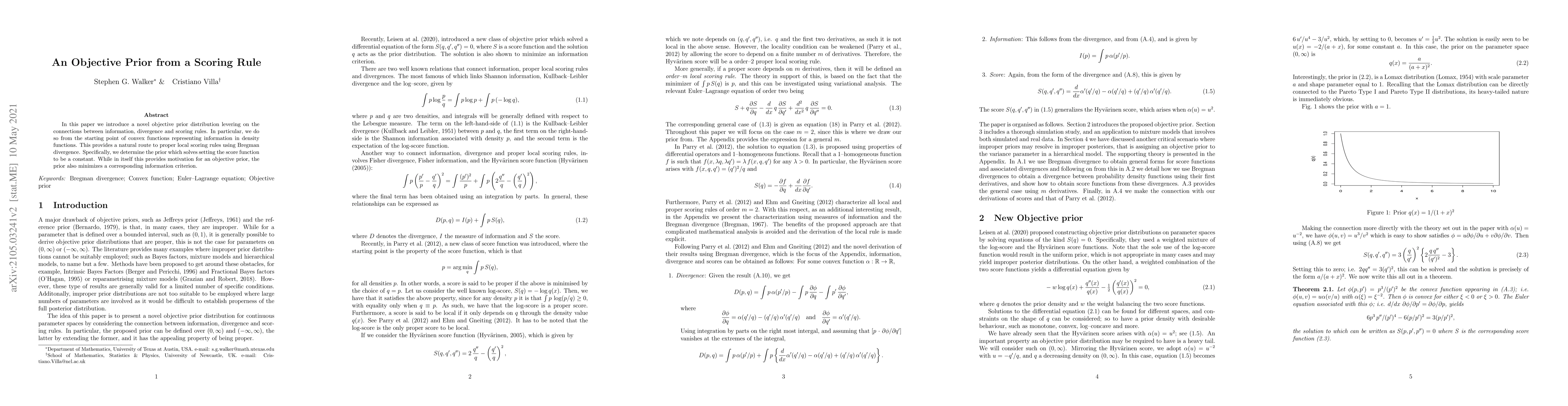 A novel objective prior distribution is introduced based on connections between information, divergence, and scoring rules. This prior minimizes a corresponding information criterion while solving for a constant score function.