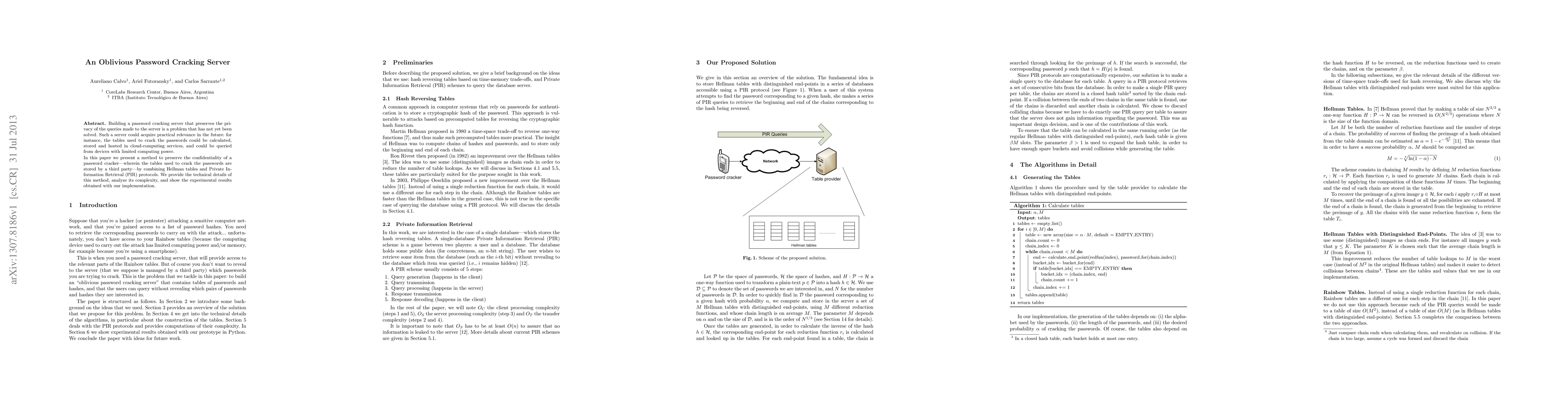 This paper proposes a method to build an oblivious password cracking server that maintains user query privacy by combining Hellman tables and Private Information Retrieval protocols. The authors detail the technical implementation, analyze the complexity, and present experimental results demonstrating the effectiveness of their approach.