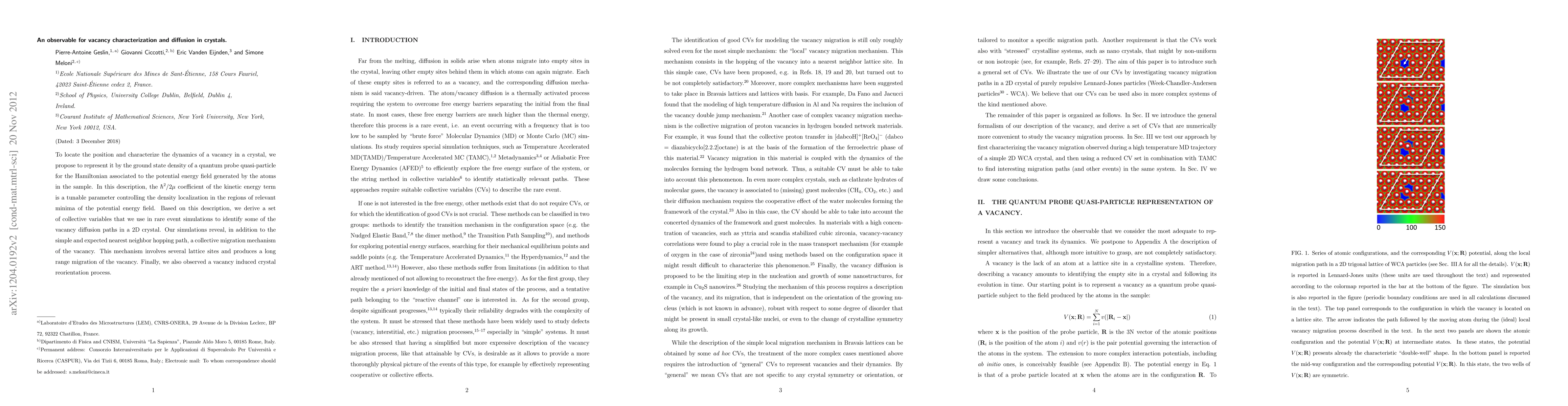 To locate the position and characterize the dynamics of a vacancy in a crystal, we propose to represent it by the ground state density of a quantum probe quasi-particle for the Hamiltonian associated to the potential energy field generated by the atoms in the sample. In this description, the h^2/2mu coefficient of the kinetic energy term is a tunable parameter controlling the density localization in the regions of relevant minima of the potential energy field. Based on this description, we derive a set of collective variables that we use in rare event simulations to identify some of the vacancy diffusion paths in a 2D crystal. Our simulations reveal, in addition to the simple and expected nearest neighbor hopping path, a collective migration mechanism of the vacancy. This mechanism involves several lattice sites and produces a long range migration of the vacancy. Finally, we also observed a vacancy induced crystal reorientation process.