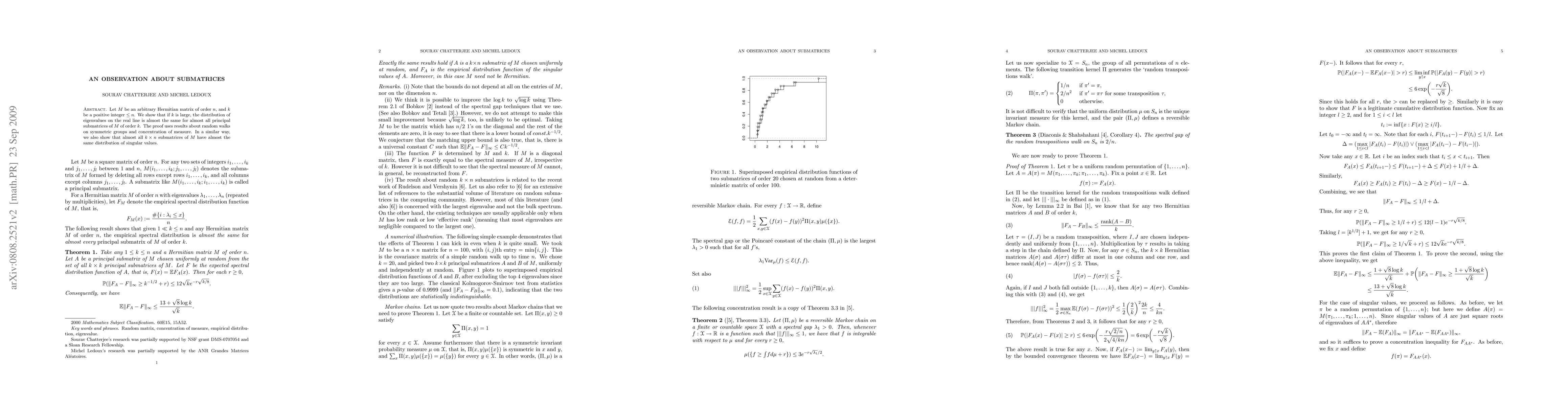 This paper demonstrates that for large k, the eigenvalue distribution of principal submatrices of a Hermitian matrix M is nearly identical, leveraging results from random walks on symmetric groups and concentration of measure. It also shows that k x n submatrices of M share similar distributions of singular values.