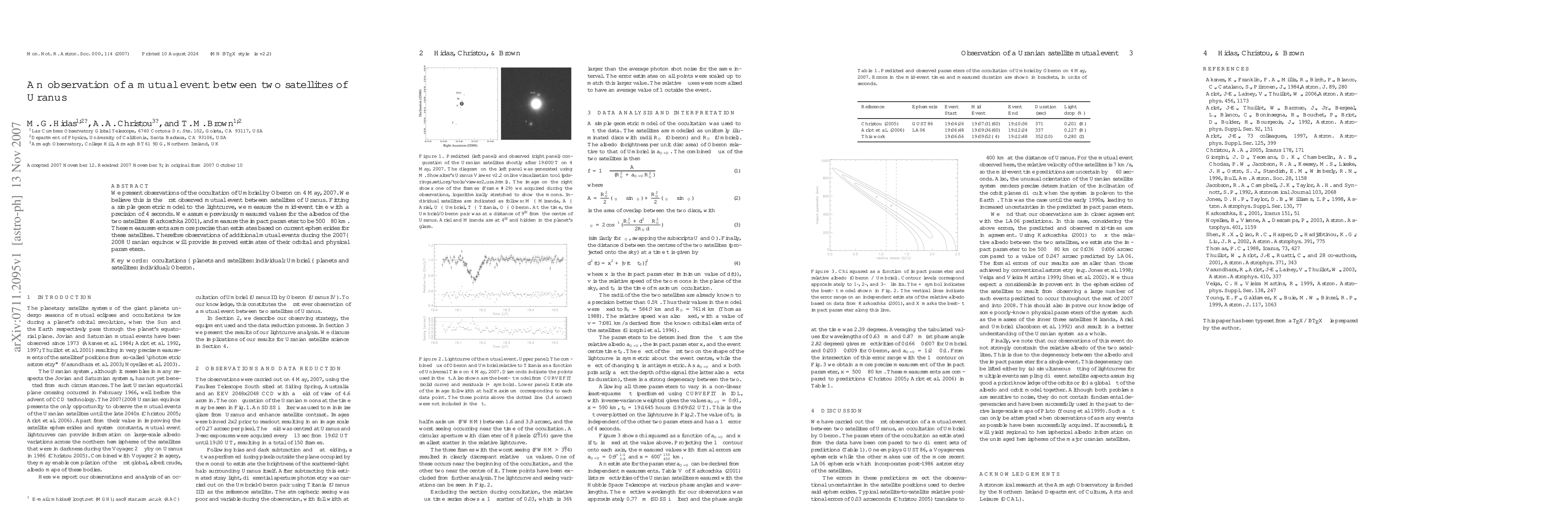 This study reports the first observation of a mutual event between Uranus' satellites, specifically the occultation of Umbriel by Oberon on May 4, 2007. The event's mid-time is precisely measured at 4 seconds, and the impact parameter is determined to be 500 ± 80 km, offering improved orbital data over current estimates.