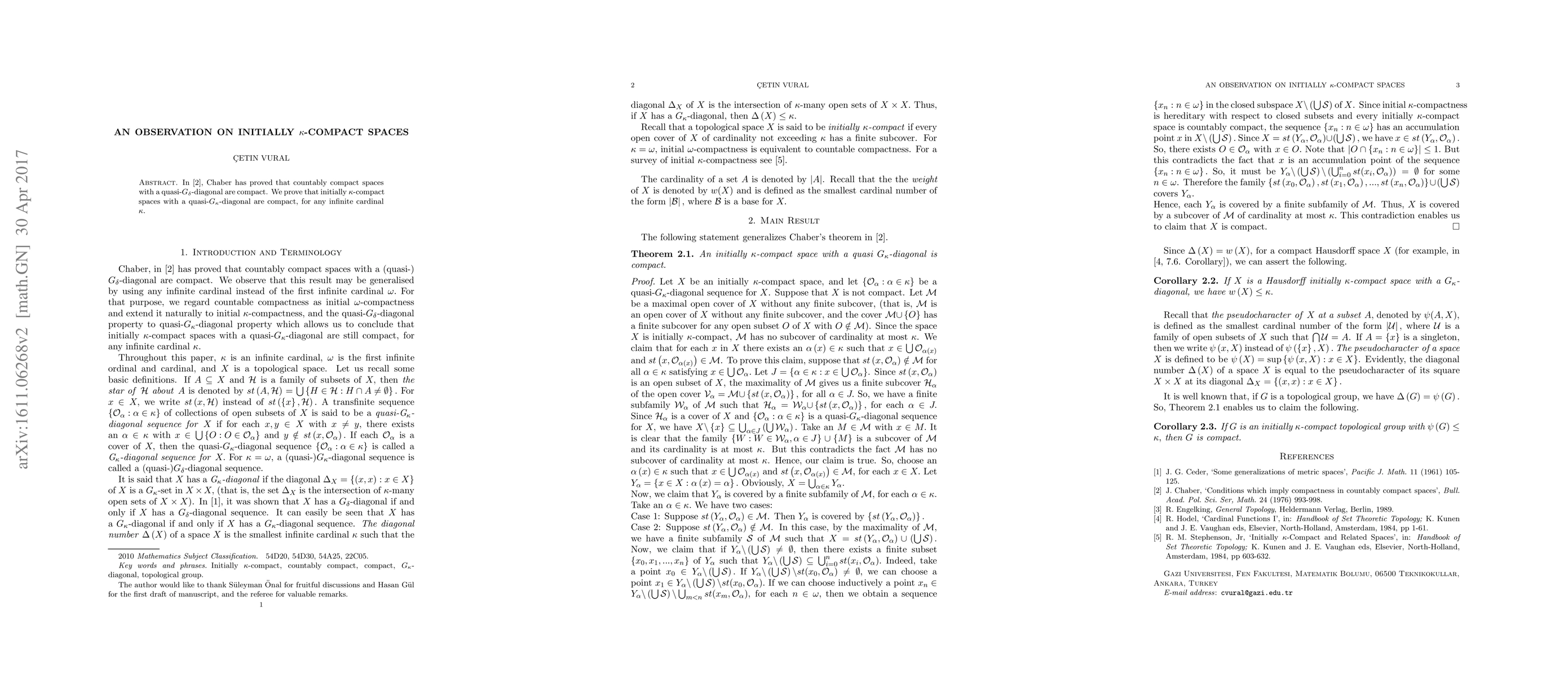 In \cite{Chaber}, Chaber has proved that countably compact spaces with a quasi $G_{\delta }$-diagonal are compact. We prove that initially $\kappa $% -compact spaces with a quasi $G_{\kappa }$-diagonal are compact, for any infinite cardinal $\kappa .