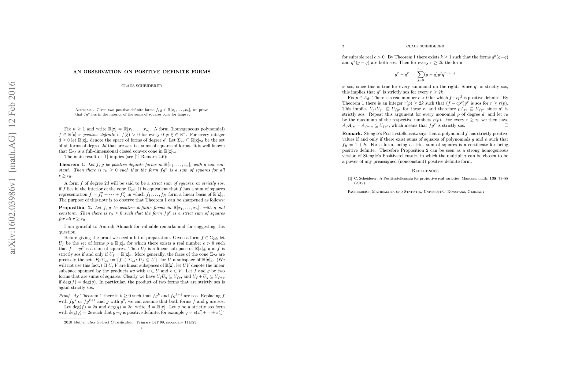 Given two positive definite forms $f,\,g\in\mathbb{R}[x_1,\dots,x_n]$, we prove that $fg^r$ lies in the interior of the sums of squares cone for large $r$.