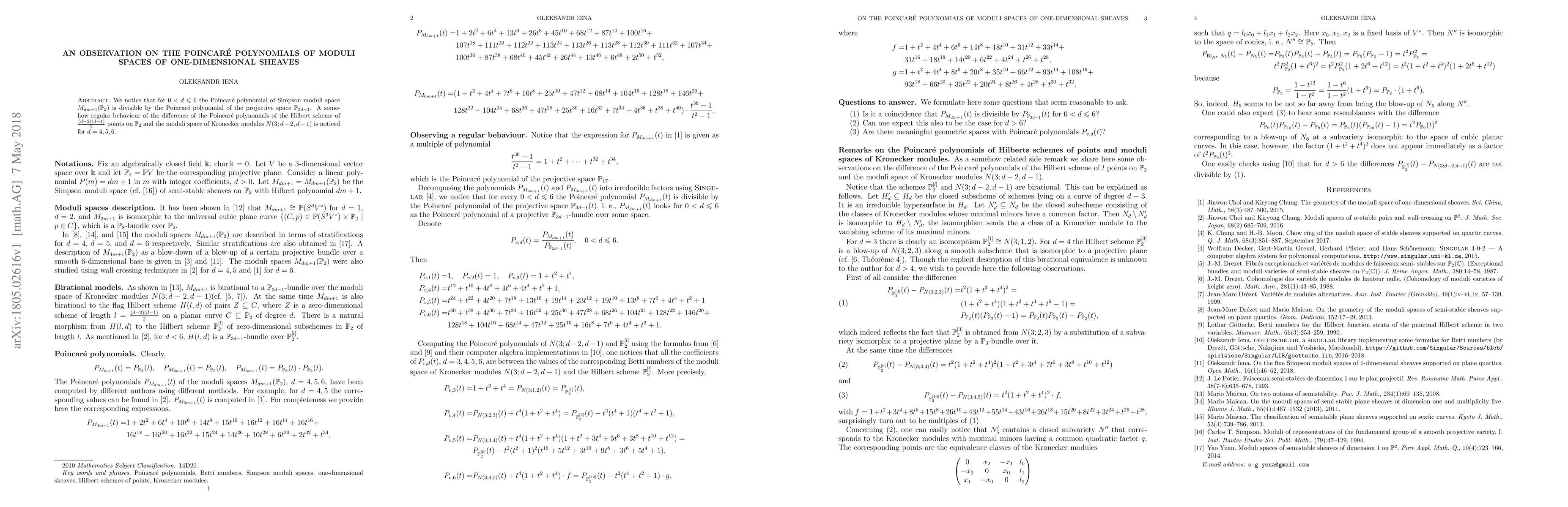 This research observes that for $0<d\le 6$, the Poincaré polynomial of the moduli space $M_{dm + 1}(\mathbb P_2)$ is divisible by the Poincaré polynomial of $\mathbb P_{3d-1}$. Additionally, it notes a regular pattern in the difference between the Poincaré polynomials of the Hilbert scheme and Kronecker module moduli spaces for $d=4, 5, 6$.