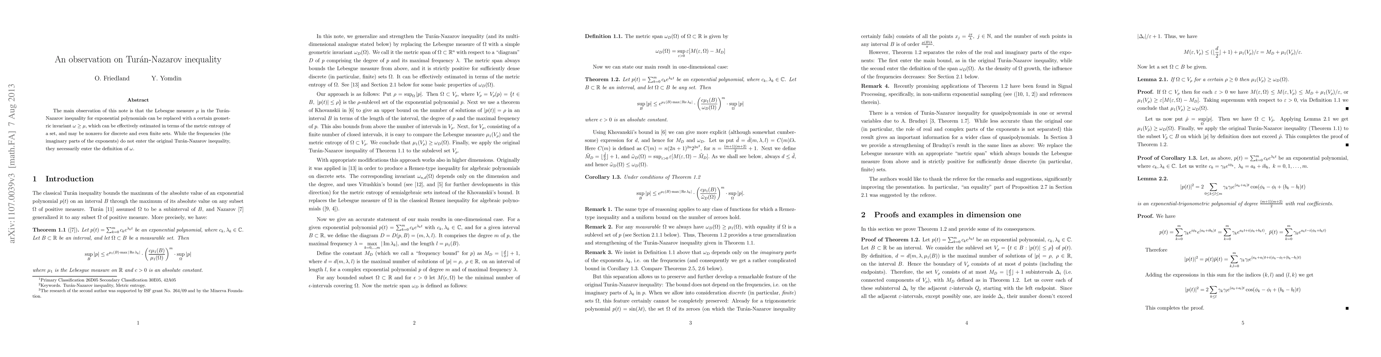 The main observation of this note is that the Lebesgue measure $\mu$ in the Tur\'an-Nazarov inequality for exponential polynomials can be replaced with a certain geometric invariant $\omega \ge \mu$, which can be effectively estimated in terms of the metric entropy of a set, and may be nonzero for discrete and even finite sets. While the frequencies (the imaginary parts of the exponents) do not enter in the original Tur\'an-Nazarov inequality, they necessarily enter the definition of $\omega$.