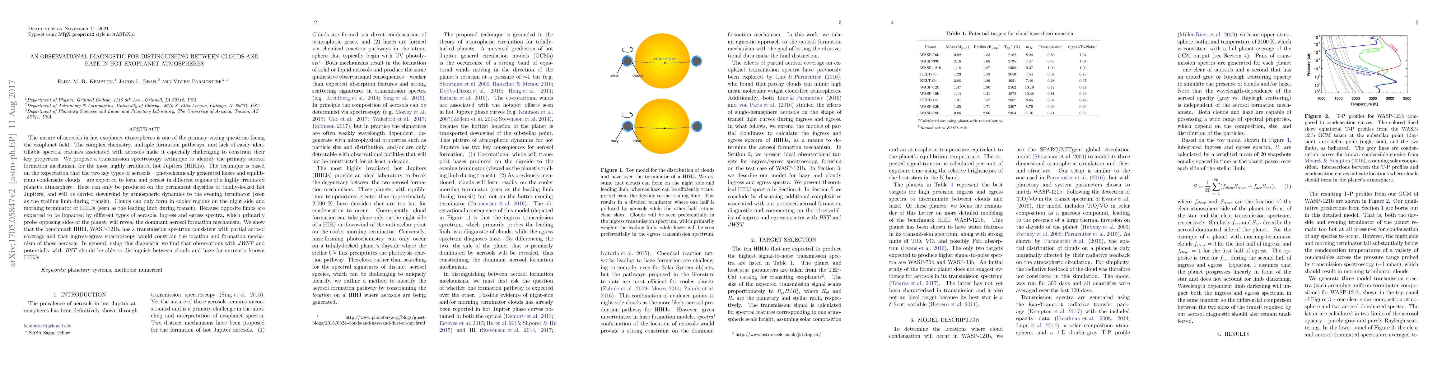 This paper proposes a transmission spectroscopy technique to differentiate between photochemical hazes and equilibrium condensate clouds in hot exoplanet atmospheres by analyzing ingress and egress spectra, which probe opposite sides of the planet. The technique is demonstrated to be applicable to the hot Jupiter WASP-121b and suggests that JWST and HST could distinguish aerosol types in highly irradiated hot Jupiters.