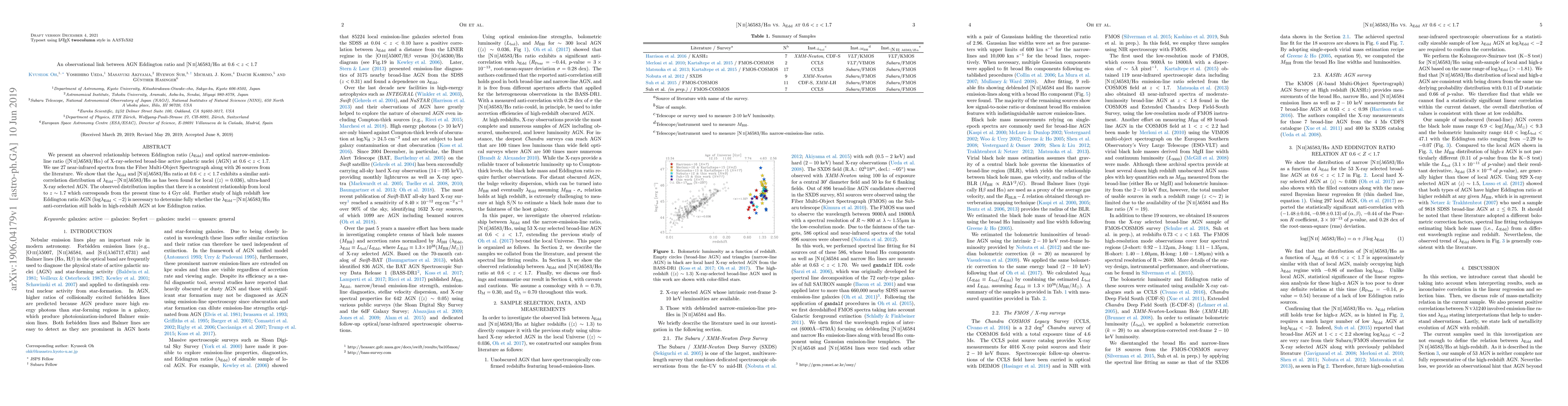 A study found an anti-correlation between Eddington ratio and optical narrow-emission-line ratio in X-ray-selected AGN at 0.6<z<1.7, similar to findings for local and ultra-hard AGN.