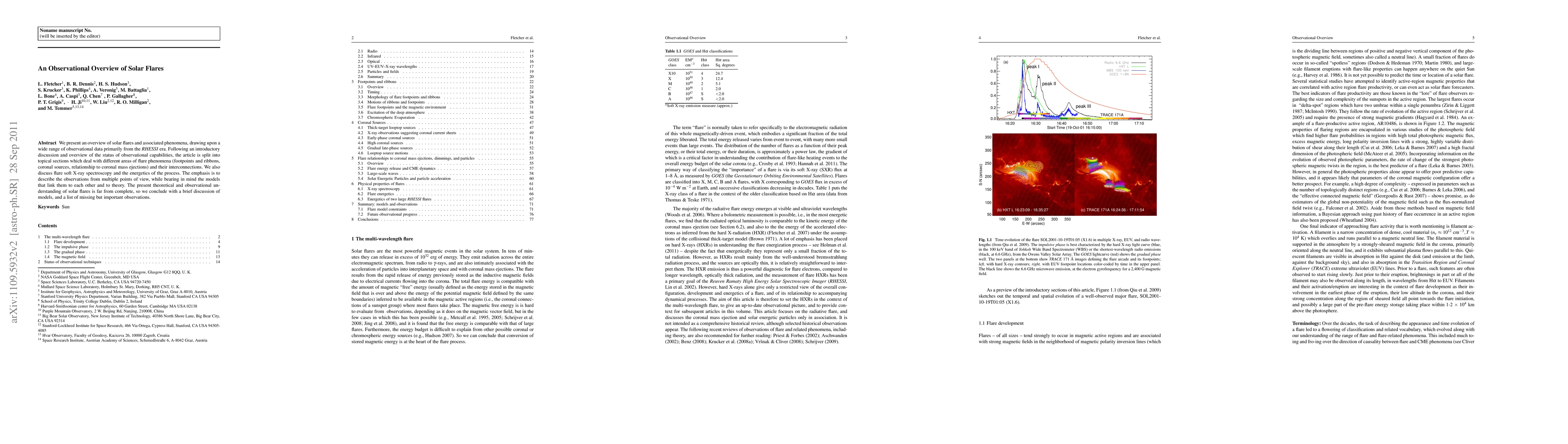 We present an overview of solar flares and associated phenomena, drawing upon a wide range of observational data primarily from the RHESSI era. Following an introductory discussion and overview of the status of observational capabilities, the article is split into topical sections which deal with different areas of flare phenomena (footpoints and ribbons, coronal sources, relationship to coronal mass ejections) and their interconnections. We also discuss flare soft X-ray spectroscopy and the energetics of the process. The emphasis is to describe the observations from multiple points of view, while bearing in mind the models that link them to each other and to theory. The present theoretical and observational understanding of solar flares is far from complete, so we conclude with a brief discussion of models, and a list of missing but important observations.