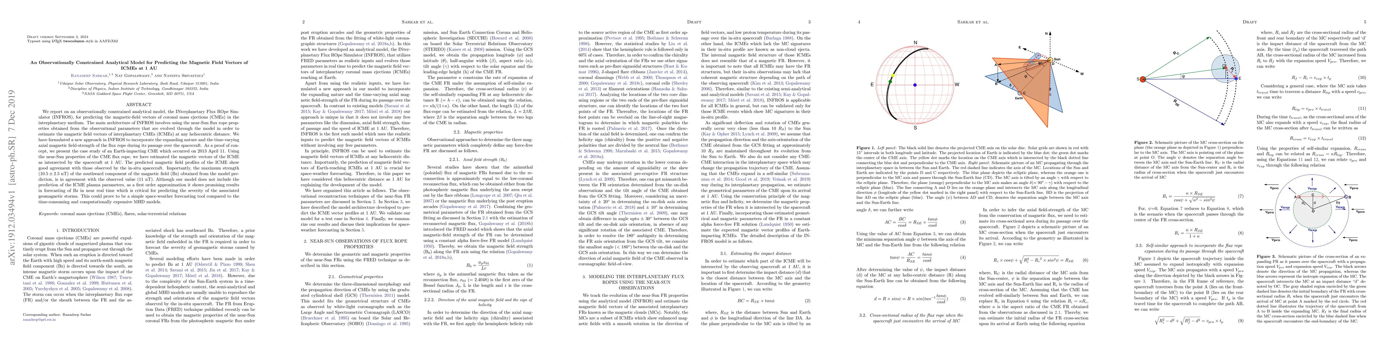 The paper introduces INFROS, an observationally constrained analytical model for predicting the magnetic field vectors of interplanetary coronal mass ejections (ICMEs) at 1 AU. The model uses near-Sun flux rope properties and shows promising results in forecasting the southward component of the magnetic field (Bz), which is crucial for predicting geomagnetic storms.