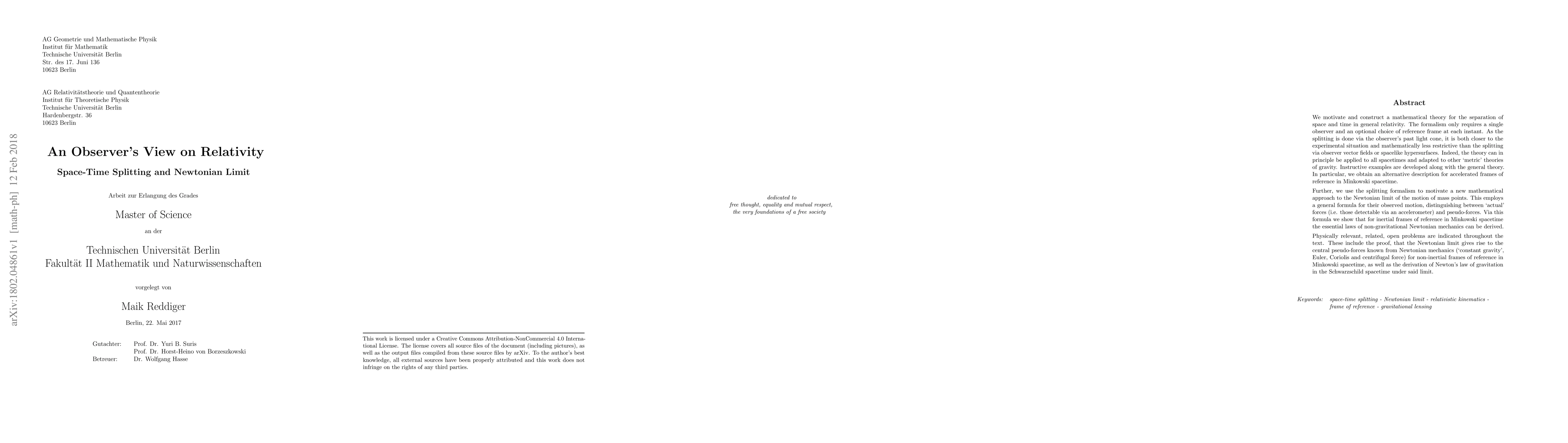 We motivate and construct a mathematical theory for the separation of space and time in general relativity. The formalism only requires a single observer and an optional choice of reference frame at each instant. As the splitting is done via the observer's past light cone, it is both closer to the experimental situation and mathematically less restrictive than the splitting via observer vector fields or spacelike hypersurfaces. Indeed, the theory can in principle be applied to all spacetimes and adapted to other `metric' theories of gravity. Instructive examples are developed along with the general theory. In particular, we obtain an alternative description for accelerated frames of reference in Minkowski spacetime. Further, we use the splitting formalism to motivate a new mathematical approach to the Newtonian limit of the motion of mass points. This employs a general formula for their observed motion, distinguishing between `actual' forces (i.e. those detectable via an accelerometer) and pseudo-forces. Via this formula we show that for inertial frames of reference in Minkowski spacetime the essential laws of non-gravitational Newtonian mechanics can be derived. Physically relevant, related, open problems are indicated throughout the text. These include the proof, that the Newtonian limit gives rise to the central pseudo-forces known from Newtonian mechanics (`constant gravity', Euler, Coriolis and centrifugal force) for non-inertial frames of reference in Minkowski spacetime, as well as the derivation of Newton's law of gravitation in the Schwarzschild spacetime under said limit. This is a slightly corrected version of a master's thesis in mathematical relativity, written at TU Berlin in 2016/2017. Comments by the reviewers have been taken into account. If there are any remaining errors, they are solely due to the author.