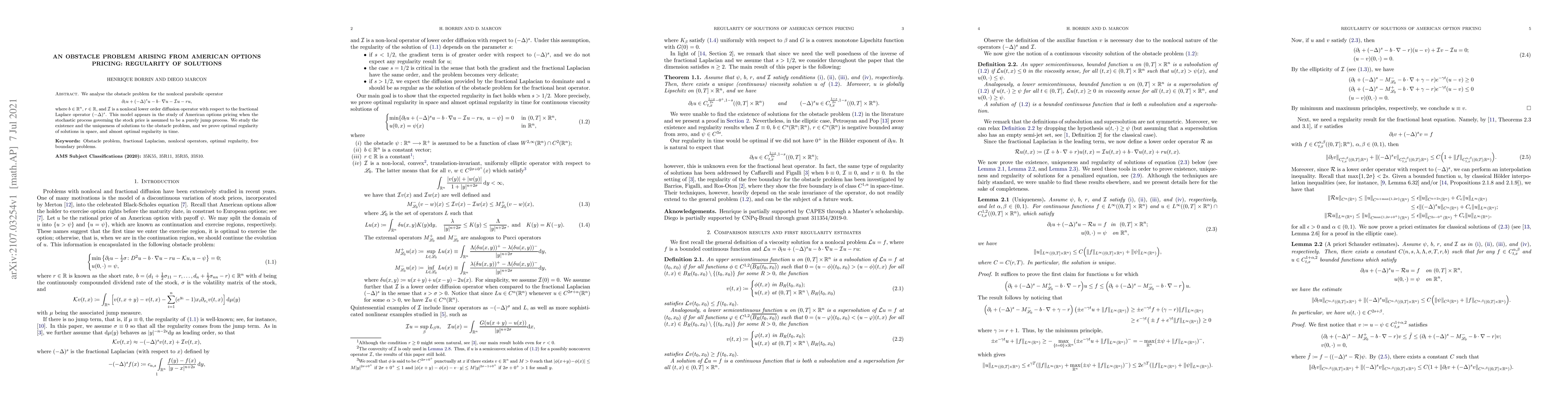 We analyse the obstacle problem for the nonlocal parabolic operator \[\partial_t u + (-\Delta)^{s} u - b \cdot \nabla u - \mathcal{I}u - ru,\] where $b\in\mathbb{R}^n$, $r\in\mathbb{R}$, and $\mathcal{I}$ is a nonlocal lower order diffusion operator with respect to the fractional Laplace operator $(-\Delta)^{s}$. This model appears in the study of American options pricing when the stochastic process governing the stock price is assumed to be a purely jump process. We study the existence and the uniqueness of solutions to the obstacle problem, and we prove optimal regularity of solutions in space, and almost optimal regularity in time.