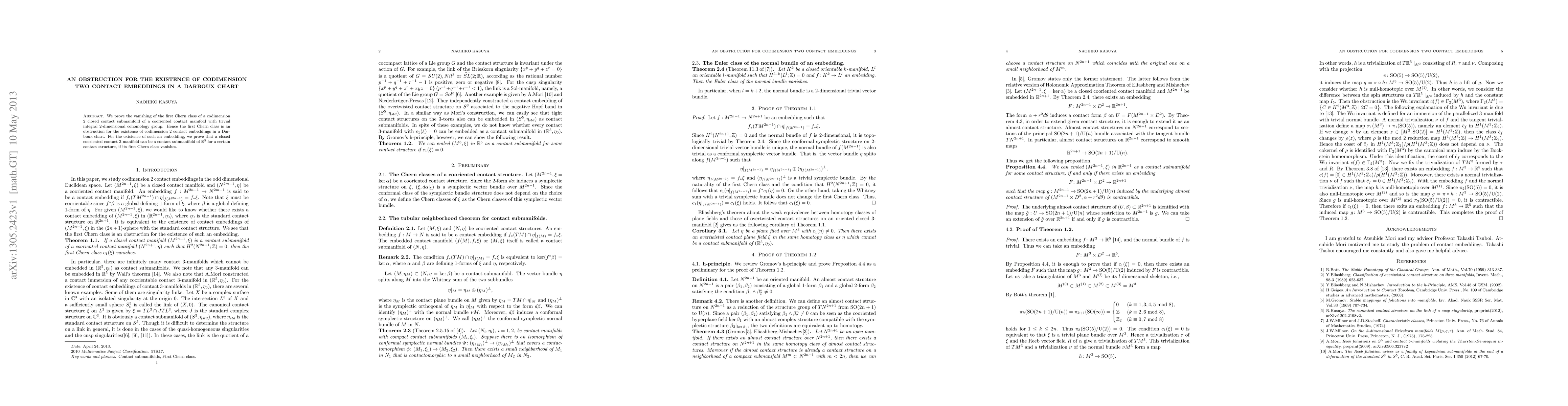 Summary: The paper proves that the vanishing of the first Chern class acts as an obstruction for codimension two contact embeddings in a Darboux chart. It also shows that a closed cooriented contact 3-manifold can embed in a 5-dimensional Euclidean space if its first Chern class is zero.
