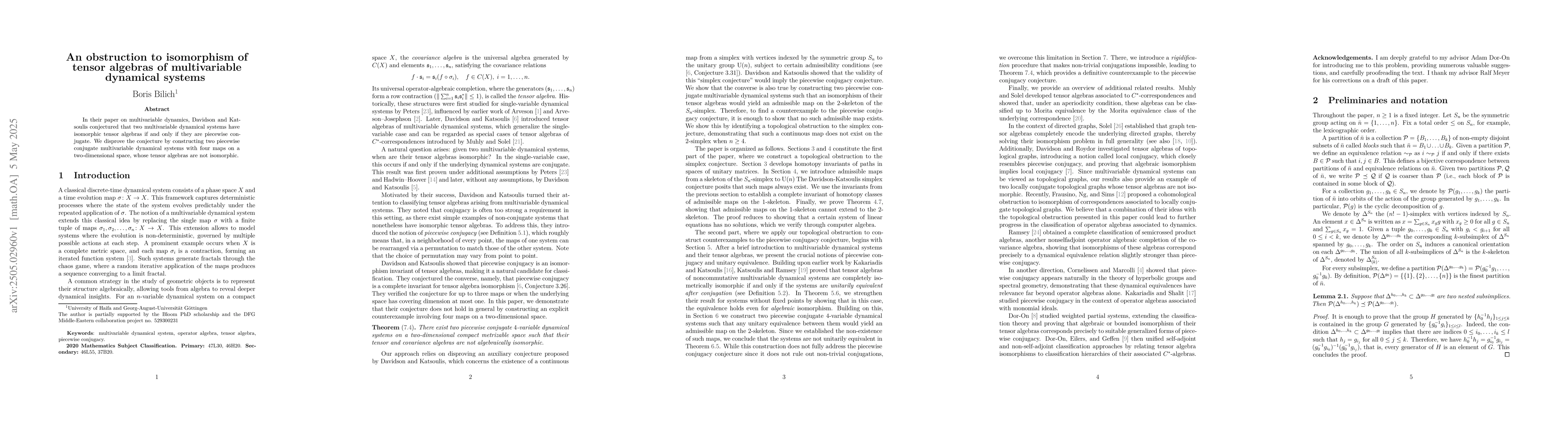 The paper presents a detailed construction of an obstruction to isomorphism of tensor algebras using invariants derived from admissible maps, thereby disproving the piecewise conjugacy conjecture for tensor algebras of multivariable dynamical systems.