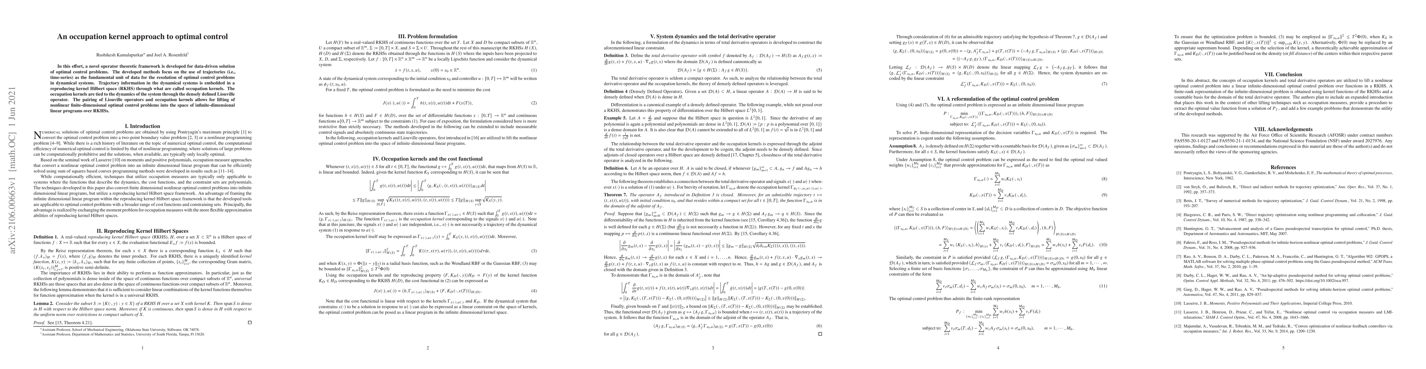 This paper introduces a novel operator theoretic framework for solving optimal control problems using trajectory data embedded in a reproducing kernel Hilbert space via occupation kernels. The method leverages the Liouville operator to transform finite-dimensional nonlinear problems into infinite-dimensional linear programs.