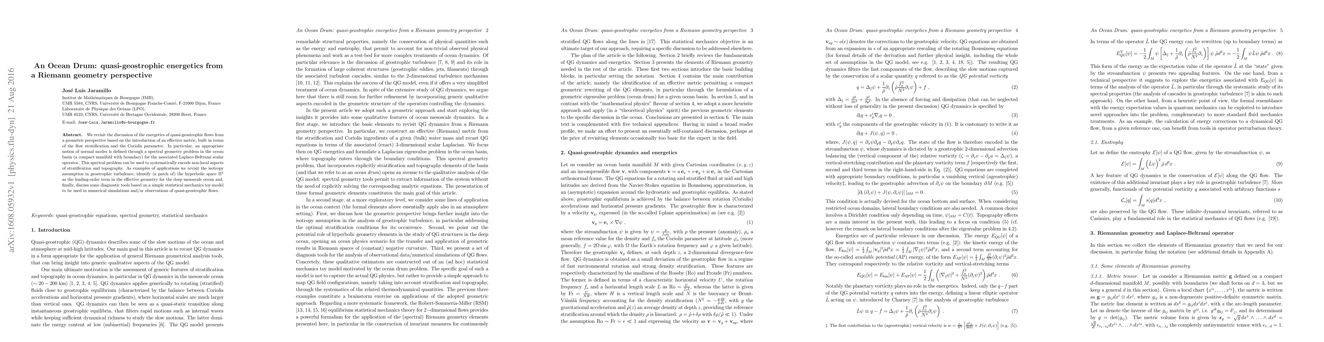 This paper explores quasi-geostrophic flow energetics using Riemann geometry, introducing an effective metric based on flow stratification and the Coriolis parameter. It defines normal modes via a spectral geometry problem for the ocean basin's Laplace-Beltrami operator, providing insights into geostrophic turbulence and identifying deep mesoscale ocean geometry as hyperbolic space.