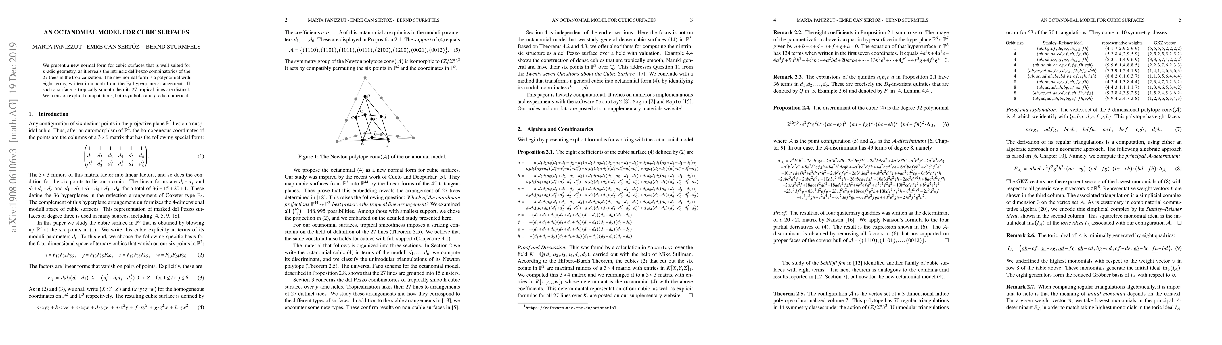 The paper introduces an octanomial model for cubic surfaces tailored for p-adic geometry, highlighting the del Pezzo combinatorics of the 27 tropical lines. It emphasizes explicit computations for both symbolic and p-adic numerical analysis of tropically smooth surfaces.