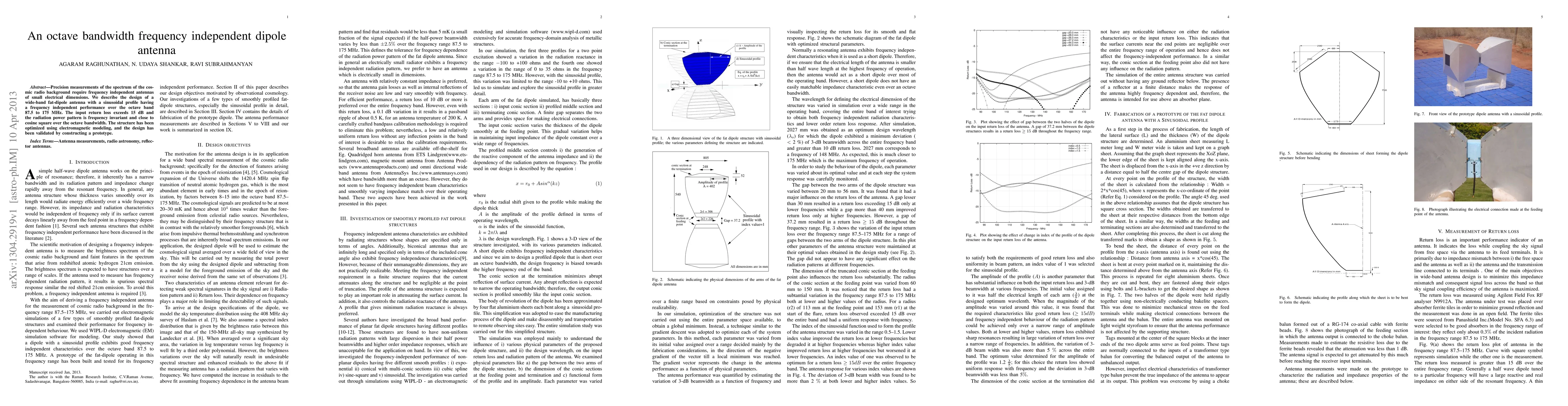 Precision measurements of the spectrum of the cosmic radio background require frequency independent antennas of small electrical dimensions. We describe the design of a wide-band fat-dipole antenna with a sinusoidal profile having a frequency independent performance over the octave band 87.5 to 175 MHz. The input return loss exceeds 15 dB and the radiation power pattern is frequency invariant and close to cosine square over the octave bandwidth. The structure has been optimized using electromagnetic modeling, and the design has been validated by constructing a prototype.
