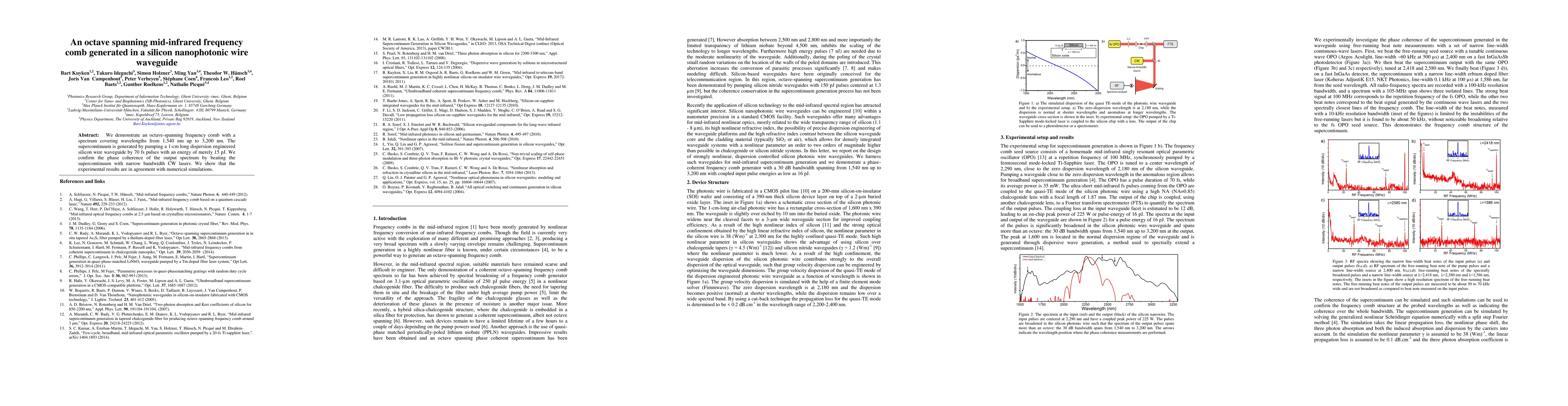 This paper presents a silicon nanophotonic wire waveguide generating an octave-spanning frequency comb from 1,540 nm to 3,200 nm using 70 fs pulses at 15 pJ, and confirms phase coherence through comparison with numerical simulations.