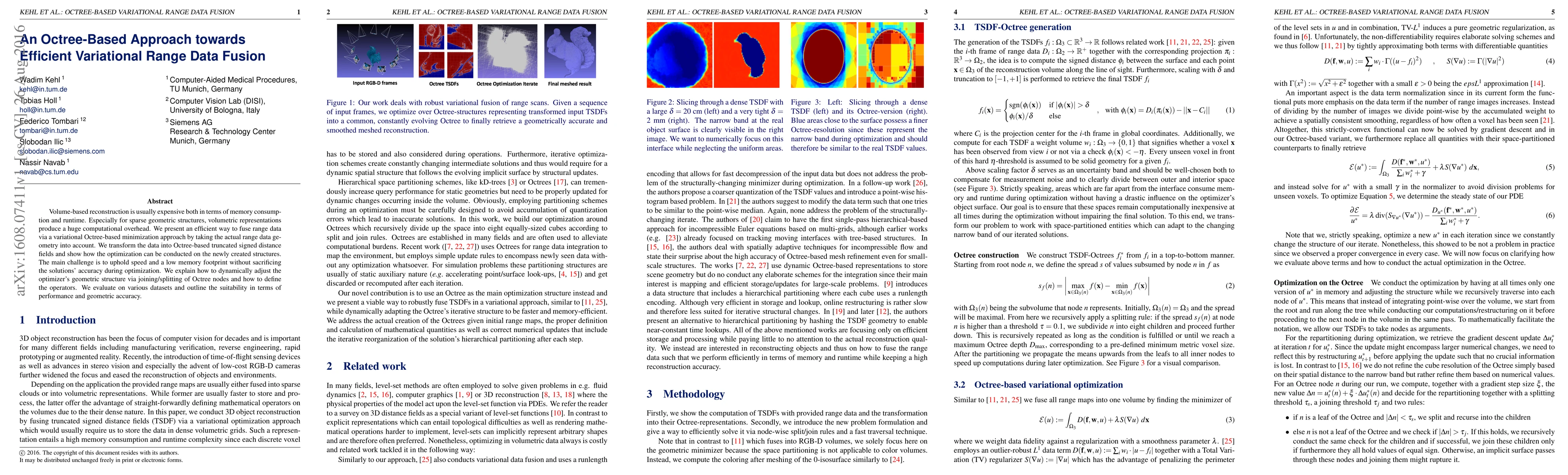 This paper presents an efficient Octree-based approach for variational range data fusion, transforming data into truncated signed distance fields to optimize reconstruction while minimizing memory and runtime overhead. The method dynamically adjusts the Octree structure and defines optimization operators to maintain accuracy, evaluated on various datasets for performance and geometric fidelity.