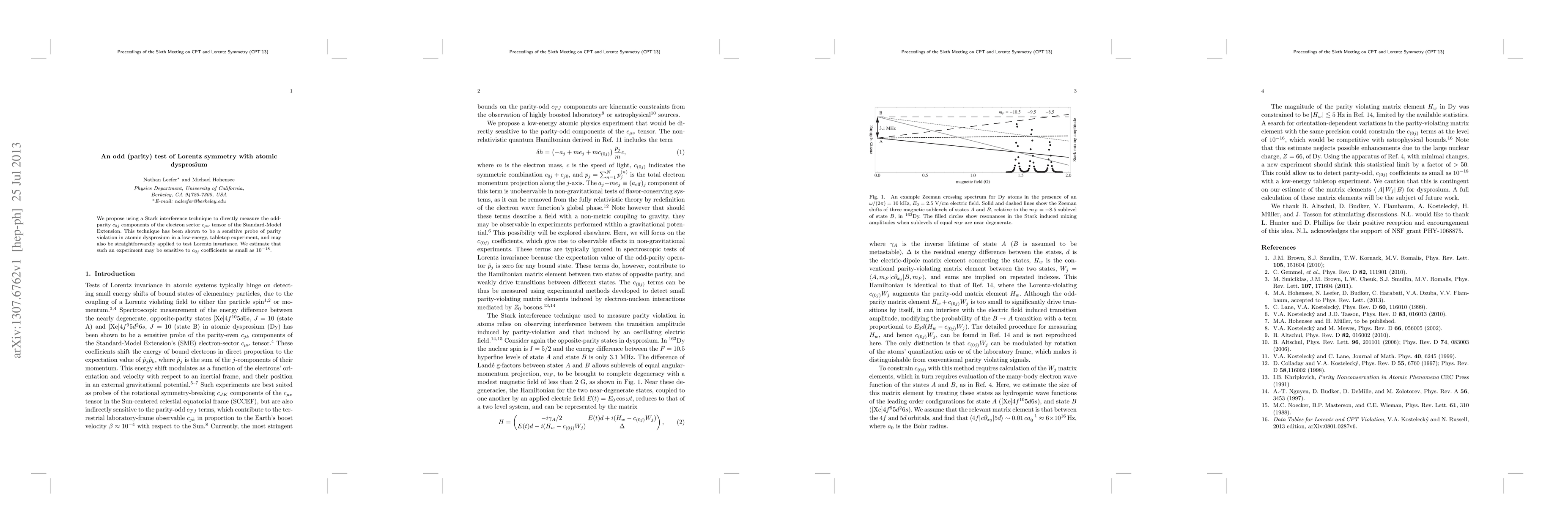 This paper proposes a Stark interference technique to measure odd-parity components of the electron sector tensor in atomic dysprosium, aiming to test Lorentz symmetry and estimate coefficients as small as 10^{-18} in a low-energy experiment.