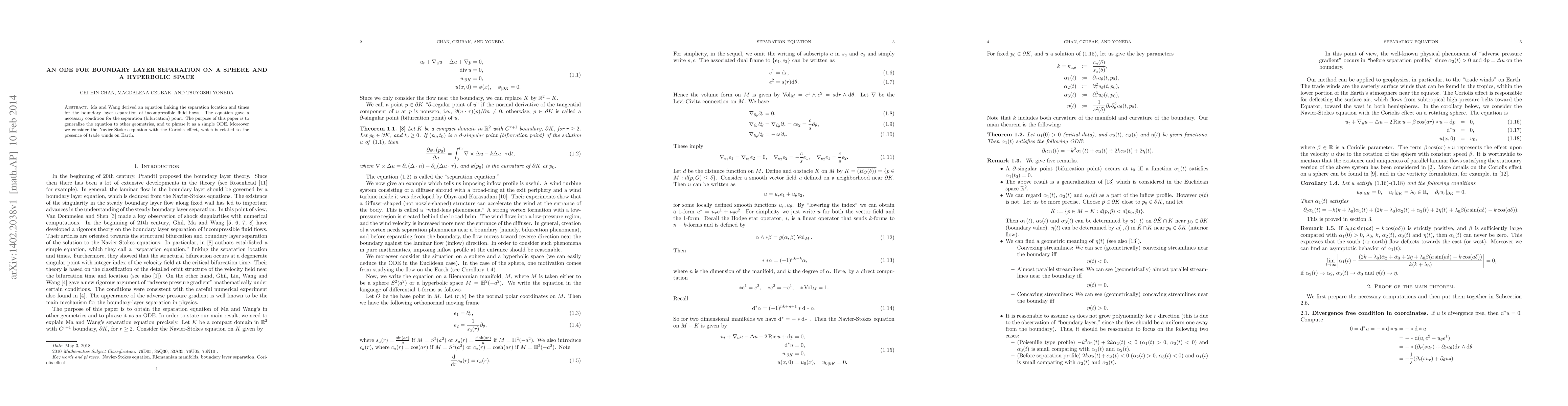 This paper generalizes an equation for boundary layer separation on spheres and hyperbolic spaces, reformulating it as a simple ordinary differential equation (ODE). It also incorporates the Navier-Stokes equation with the Coriolis effect to model trade winds.