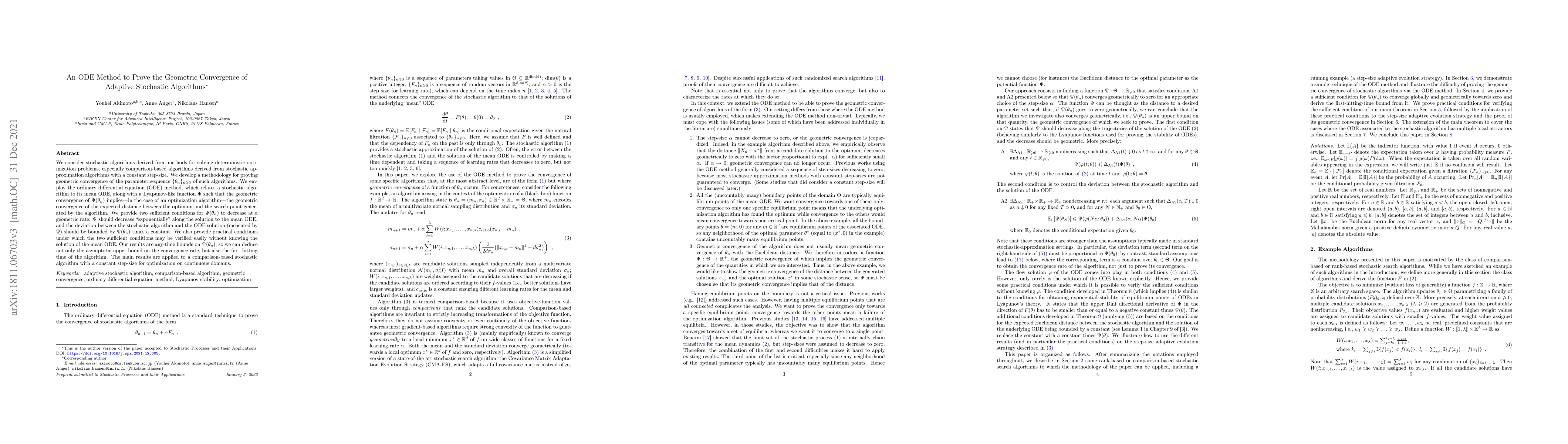 A new method using ordinary differential equations (ODEs) is proposed to prove geometric convergence of adaptive stochastic algorithms for optimization problems, providing anytime bounds on the convergence rate and first hitting time.