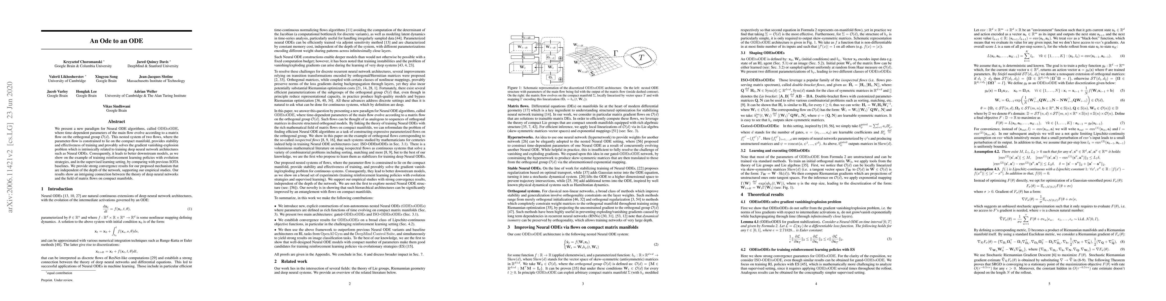 A new neural network paradigm called ODEtoODE improves training stability and effectiveness by evolving time-dependent parameters according to a matrix flow on the orthogonal group, leading to better performance in reinforcement learning and supervised learning tasks.