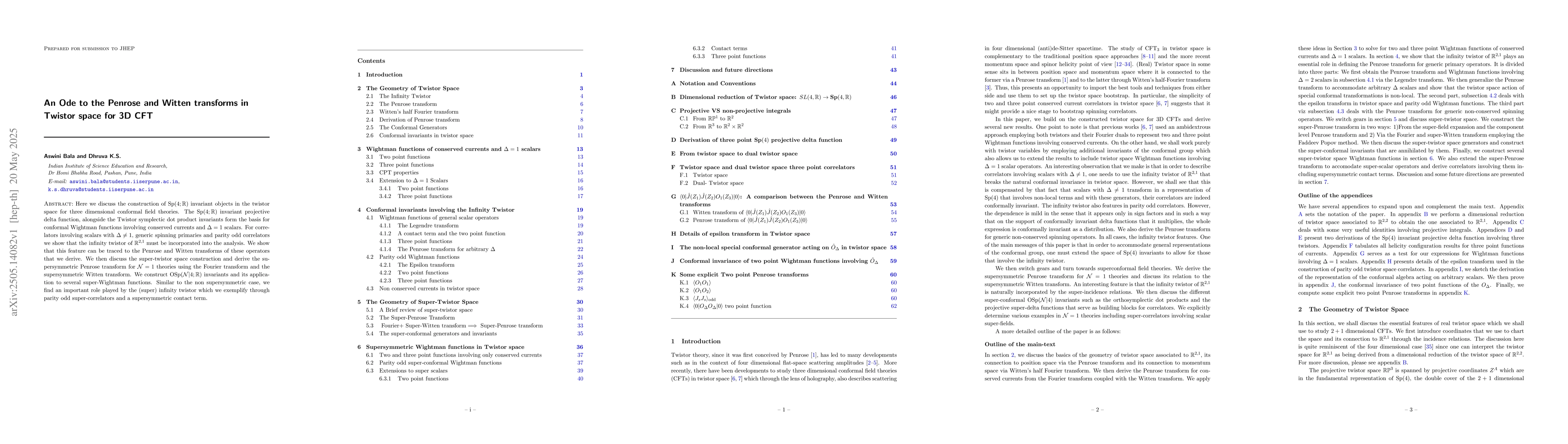 The paper constructs Sp(4;R) invariant objects in twistor space for 3D conformal field theories, deriving Penrose and Witten transforms, and extending to supersymmetric OSp(N|4;R) invariants for N=1 theories using Fourier and supersymmetric Witten transforms.