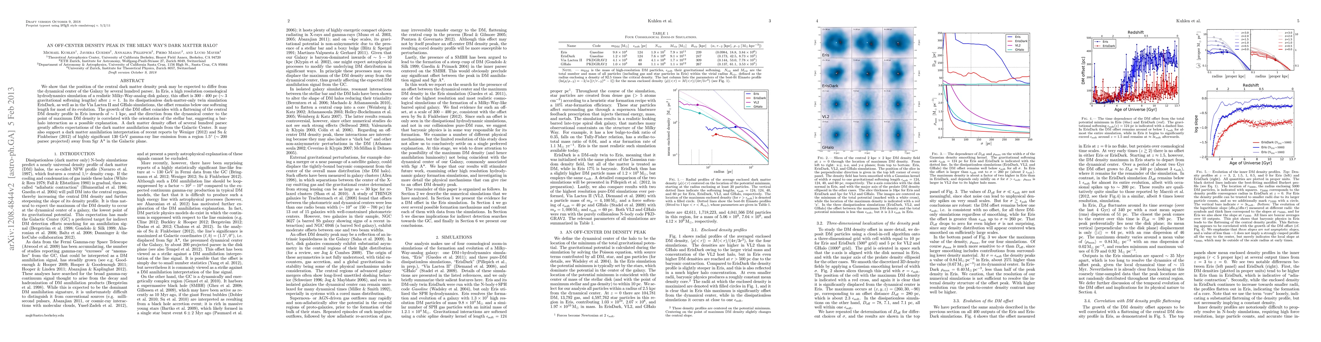 We show that the position of the central dark matter density peak may be expected to differ from the dynamical center of the Galaxy by several hundred parsec. In Eris, a high resolution cosmological hydrodynamics simulation of a realistic Milky-Way-analog disk galaxy, this offset is 300 - 400 pc (~3 gravitational softening lengths) after z=1. In its dissipationless dark-matter-only twin simulation ErisDark, as well as in the Via Lactea II and GHalo simulations, the offset remains below one softening length for most of its evolution. The growth of the DM offset coincides with a flattening of the central DM density profile in Eris inwards of ~1 kpc, and the direction from the dynamical center to the point of maximum DM density is correlated with the orientation of the stellar bar, suggesting a bar-halo interaction as a possible explanation. A dark matter density offset of several hundred parsec greatly affects expectations of the dark matter annihilation signals from the Galactic Center. It may also support a dark matter annihilation interpretation of recent reports by Weniger (2012) and Su & Finkbeiner (2012) of highly significant 130 GeV gamma-ray line emission from a region 1.5 degrees (~200 parsec projected) away from Sgr A* in the Galactic plane.