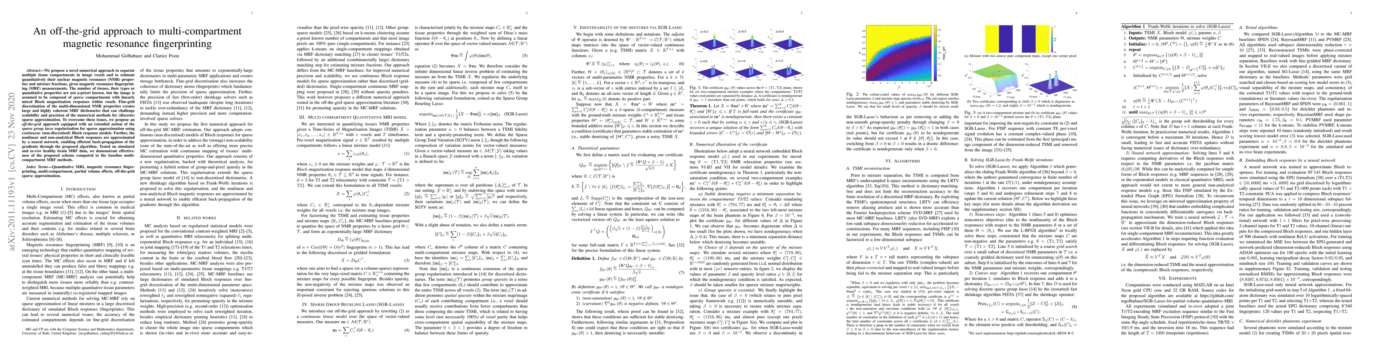 This paper proposes a novel off-the-grid numerical approach for multi-compartment magnetic resonance fingerprinting, utilizing sparse group lasso regularisation and neural network approximations to estimate tissue properties without prior knowledge of tissue types or quantities. The method demonstrates effectiveness in separating and quantifying tissue compartments in both simulated and in-vivo brain data.