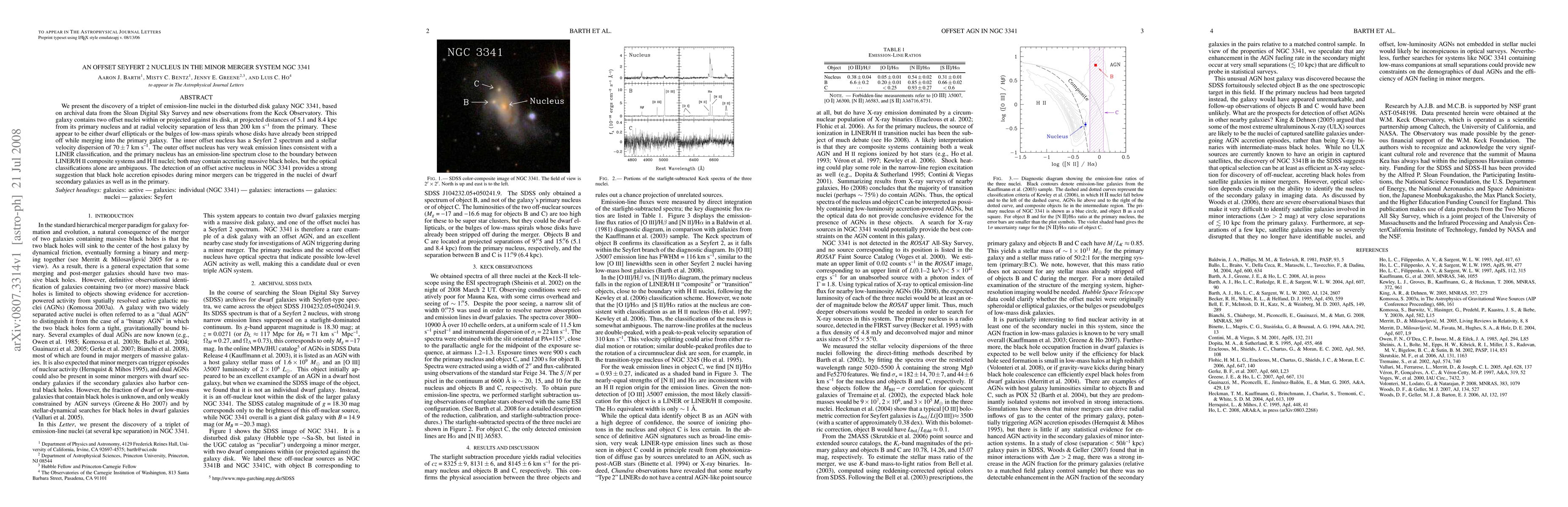 We present the discovery of a triplet of emission-line nuclei in the disturbed disk galaxy NGC 3341, based on archival data from the Sloan Digital Sky Survey and new observations from the Keck Observatory. This galaxy contains two offset nuclei within or projected against its disk, at projected distances of 5.1 and 8.4 kpc from its primary nucleus and at radial velocity separation of less than 200 km/s from the primary. These appear to be either dwarf ellipticals or the bulges of low-mass spirals whose disks have already been stripped off while merging into the primary galaxy. The inner offset nucleus has a Seyfert 2 spectrum and a stellar velocity dispersion of 70+/-7 km/s. The outer offset nucleus has very weak emission lines consistent with a LINER classification, and the primary nucleus has an emission-line spectrum close to the boundary between LINER/HII composite systems and HII nuclei; both may contain accreting massive black holes, but the optical classifications alone are ambiguous. The detection of an offset active nucleus in NGC 3341 provides a strong suggestion that black hole accretion episodes during minor mergers can be triggered in the nuclei of dwarf secondary galaxies as well as in the primary.