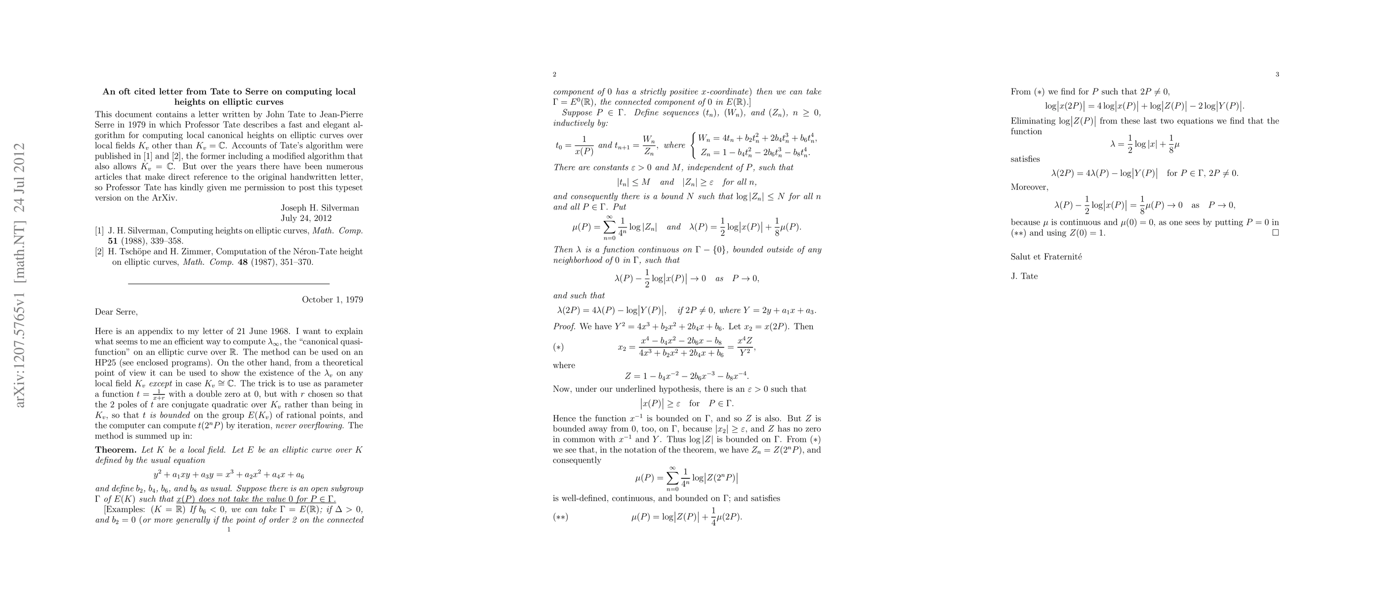 Summary: In a 1979 letter, John Tate shares an efficient algorithm with Jean-Pierre Serre for computing local heights on elliptic curves, highlighting its elegance and practical application.