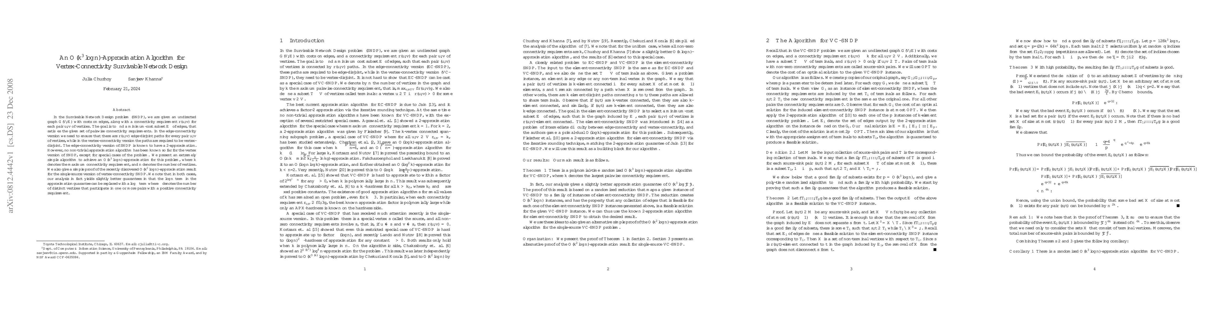 This paper presents an $O(k^3 \log n)$-approximation algorithm for the vertex-connectivity version of the Survivable Network Design Problem (SNDP), addressing the challenge of finding a minimum-cost edge subset that satisfies given vertex-disjoint connectivity requirements. The authors also provide a simpler proof for the $O(k^2 \log n)$-approximation in the single-source version.